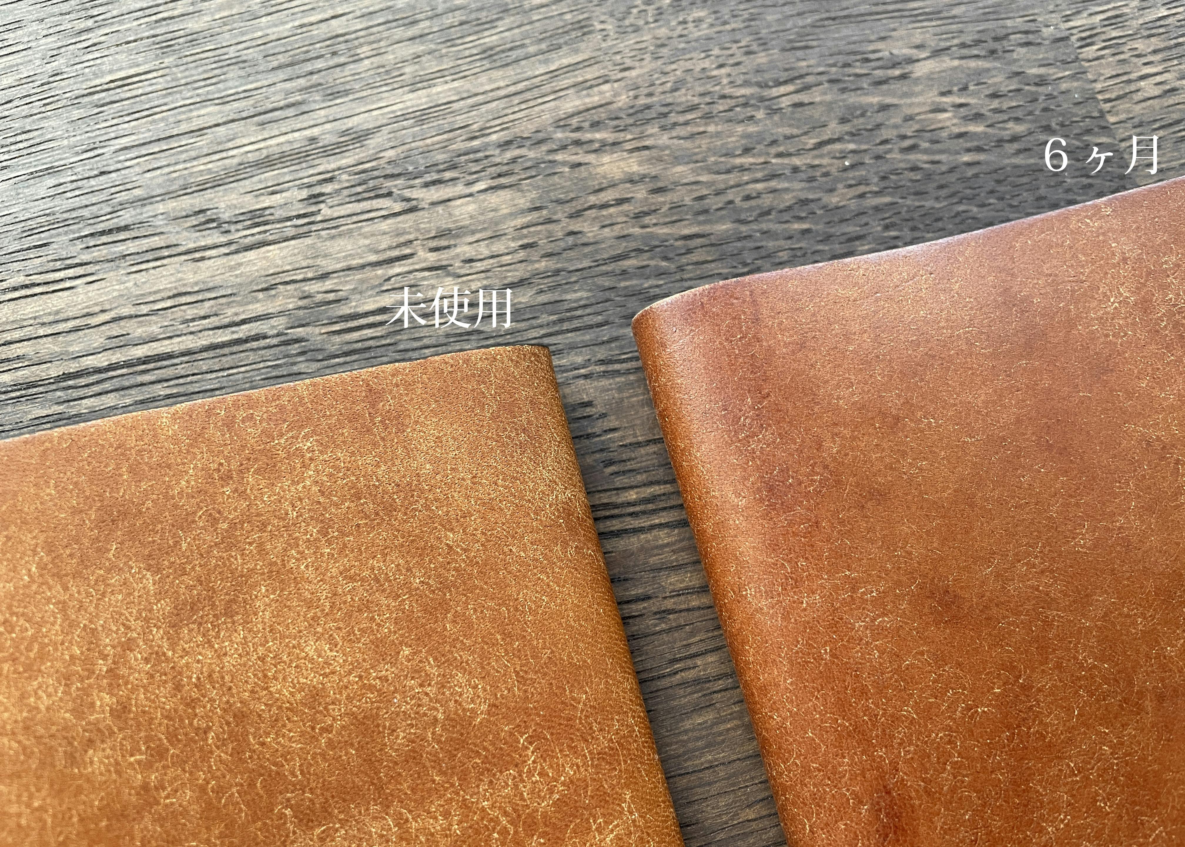 最初の状態は和紙のような手触りで、マットな質感故に光沢は殆どありませんが、使う程に表面の繊維が寝て加速度的に光沢が増していき、色も短期間で深まっていきます。