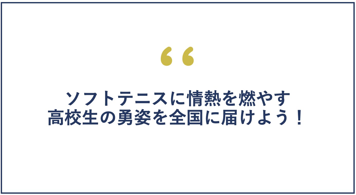 子どもたちにとって、競技だけでなく、それ以上に生きていくために必要なことが学べる本大会を、ひとりでも多くの出場される選手のご家族、会場に行きたくてもいけないソフトテニスファンの皆様に子どもたちの勇姿を届けたいと思い、今回無観客試合になってしまった全日本高等学校選抜ソフトテニス大会のライブ配信を企画しました。