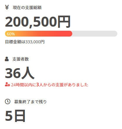 現在の調達率は60%、パトロン様は36名となっております。