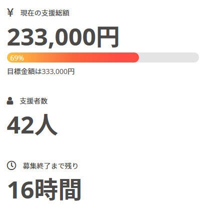 現在の調達率は69%、パトロン様は42名となっております。