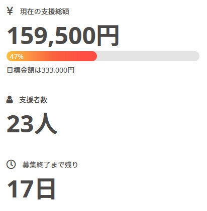 お世話になっております。 名無しの東北県人です。 前回の活動報告から現在までの間に、 新たに1名の方がご支援を行って下さいました。 現在の調達率は47%、パトロン様は23名となっております。 本当にありがとうございます。 引き続き、何卒宜しくお願い致します。 名無しの東北県人