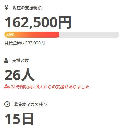 お世話になっております。 名無しの東北県人です。 前回の活動報告から現在までの間に、 新たに1名の方がご支援を行って下さいました。 現在の調達率は48%、パトロン様は26名となっております。 本当にありがとうございます。 引き続き、何卒宜しくお願い致します。 名無しの東北県人