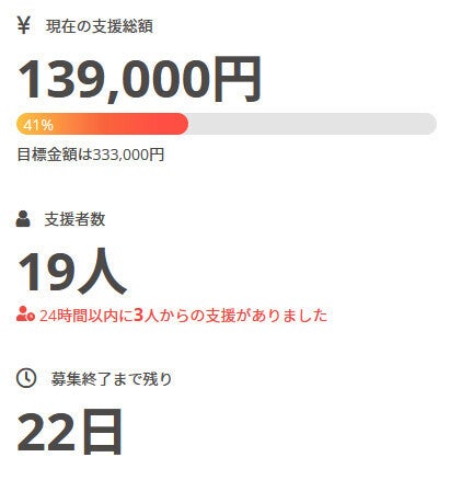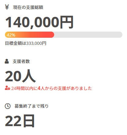 お世話になっております。 名無しの東北県人です。 前回の活動報告から現在までの間に、 新たに1名の方がご支援を行って下さいました。 現在の調達率は42%、パトロン様は20名となっております。 本当にありがとうございます。 引き続き、何卒宜しくお願い致します。 名無しの東北県人