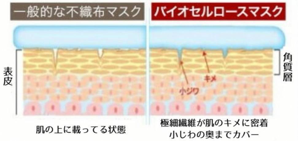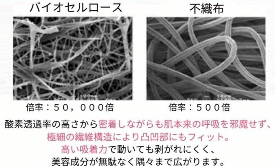 バイオセルロースは美容液の携帯性、水分保持性、密着性、に優れ、