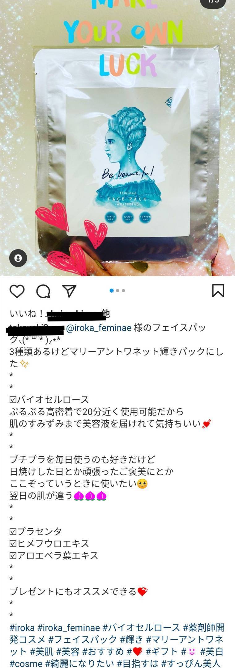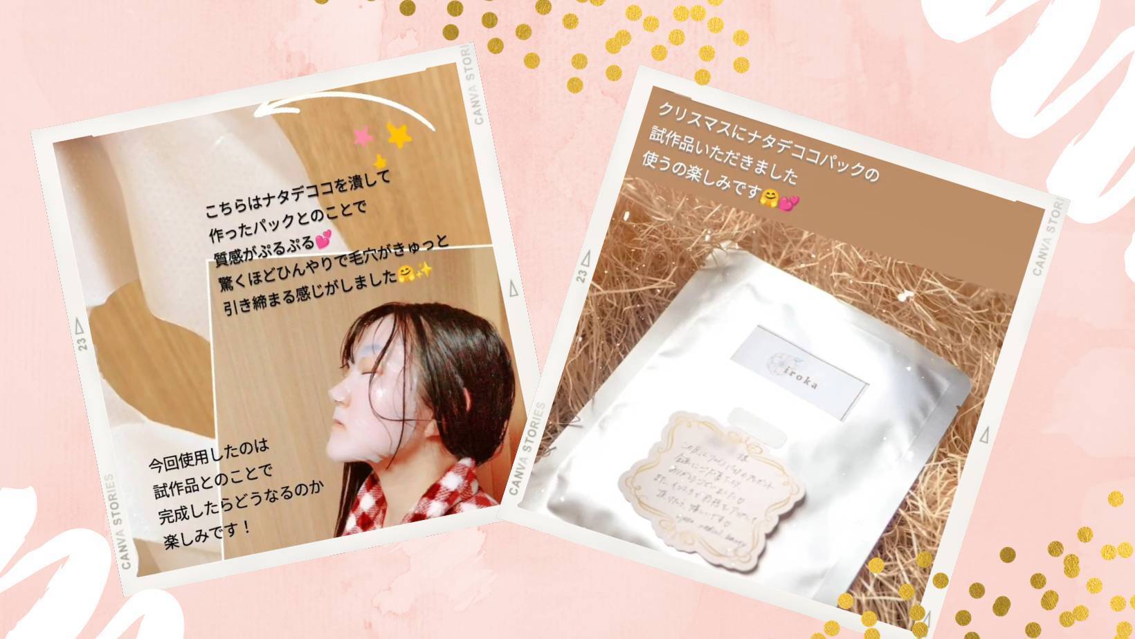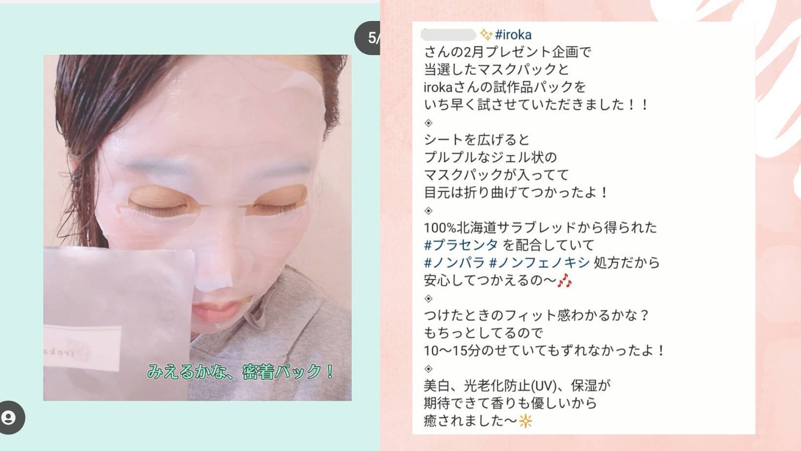2021/07/17 07:45バイオセルロースの使い心地の良さを体感してもらいたく、バイオセルロースパックを試してもらいました!写真で見て貰ってわかるように、お肌にしっかり密着します。この密着度が美容液浸透の秘訣です!!せっかく美容液の中身がしっかりしていても、お肌にきちんと届かないと意味がないんですよね。今、世の中に多く売られているパックは不織布が使用されていて、お肌に乗せているだけになってしまいます。使用していただいた方からの感想は、、、・初めての感覚に驚きました!・肌に密着度が凄いからパック中にストレッチや家事などをしてもズレないので便利でした。・パックの素材が柔らかいから、付けたときのストレスが全然なく使えました。・時間がたっても乾燥しないからずっとつけてられる!・不織布のパックは苦手だったけど、バイオセルロースは使い心地が良かったです。・ひんやりするのでお風呂上りに使うと冷たくて気持ち良かったです。・美容液もたっぷり入ってたので、首や腕にも塗れました。・使い終わったあとに肌がもっちりして、ずっと触っていたくなりました。・化粧前に使ったら肌が明るくなって、化粧ノリが良くて、会った人にエステ行った?と聞かれました!・美容液がトロッとしていて気持ち良かったです。・このパックを使ったら、これ以外使いたくなくなりました!続々と嬉しい感想を頂いています!たくさんの方にバイオセルロースのパックを使って頂いて、ぜひこの感動を体感していただきたいと思います。 もっと見るirokaフェイスパック撮影会