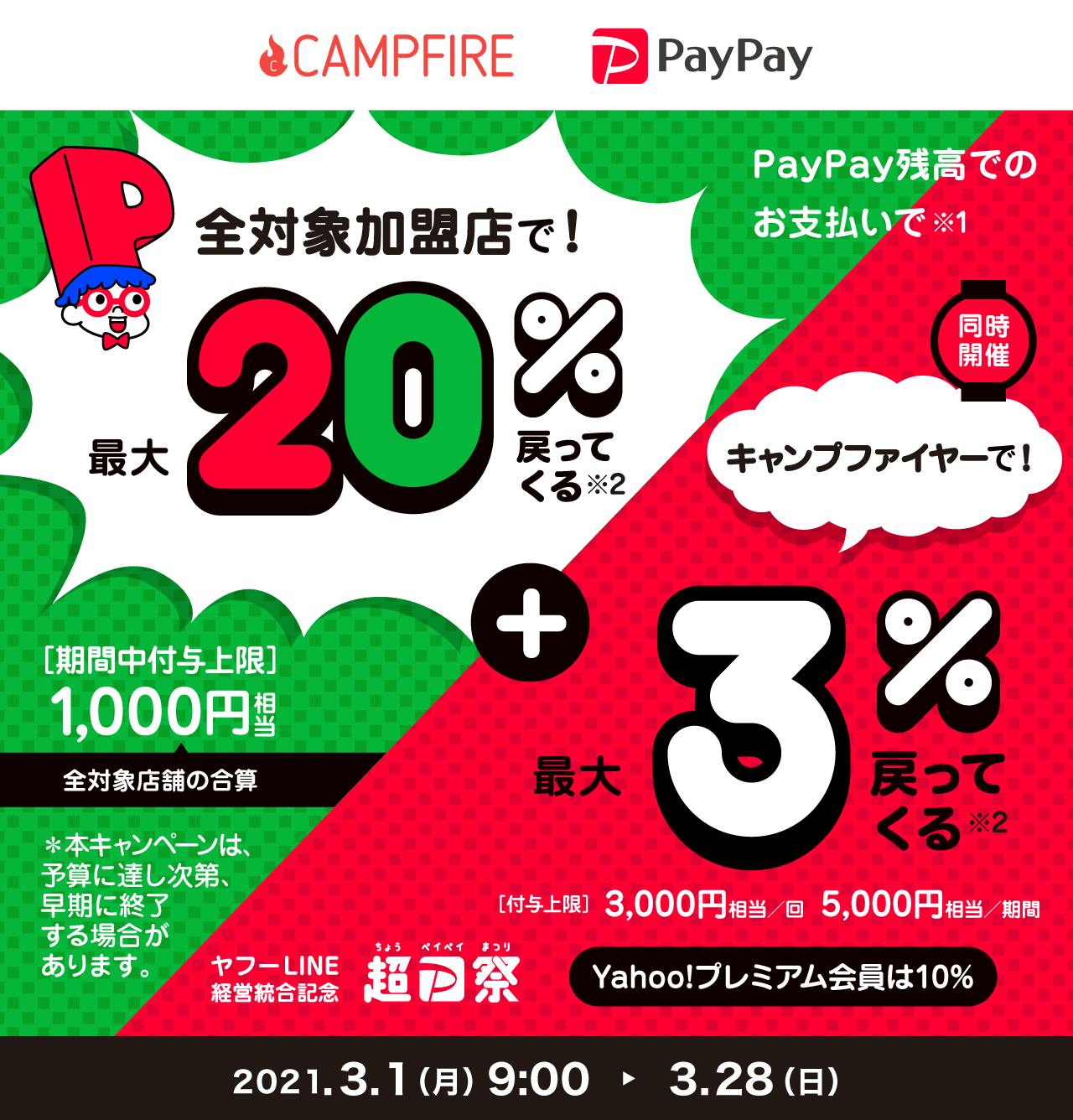 今、大規模開催中の超PayPay祭キャンペーンで、CAMPFIREでのお支払いがお得になります!