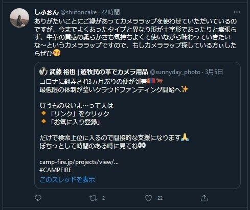 『ありがたいことにご縁があってカメララップを使わせていただいているのですが、今までよくあったタイプと異なり形が十字形であったりと嵩張らず、牛革の質感の柔らかさも気持ちよくて使いながら味わっていきたいな〜というカメララップですので、もしカメララップ探している方ぃしたらぜひ』