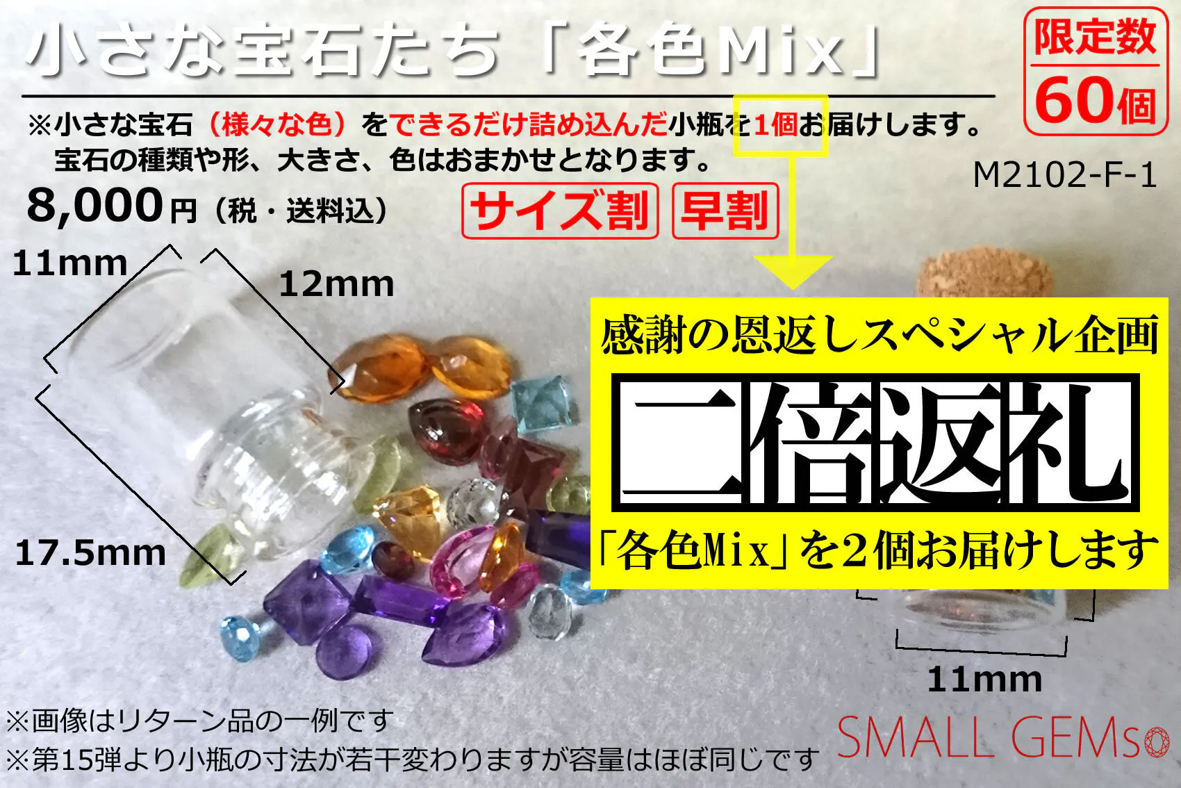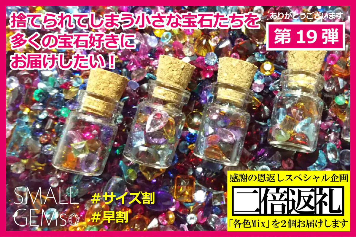 感謝の気持ちをカタチにしたいという思いから、「感謝の恩返しスペシャル企画【二倍返礼】」を継続し、ご支援いただいた皆様にお届けしているリターン品にさらに1個追加して、小さな宝石たちをできるだけ詰め込んだ小瓶を合計2個お届けいたします。