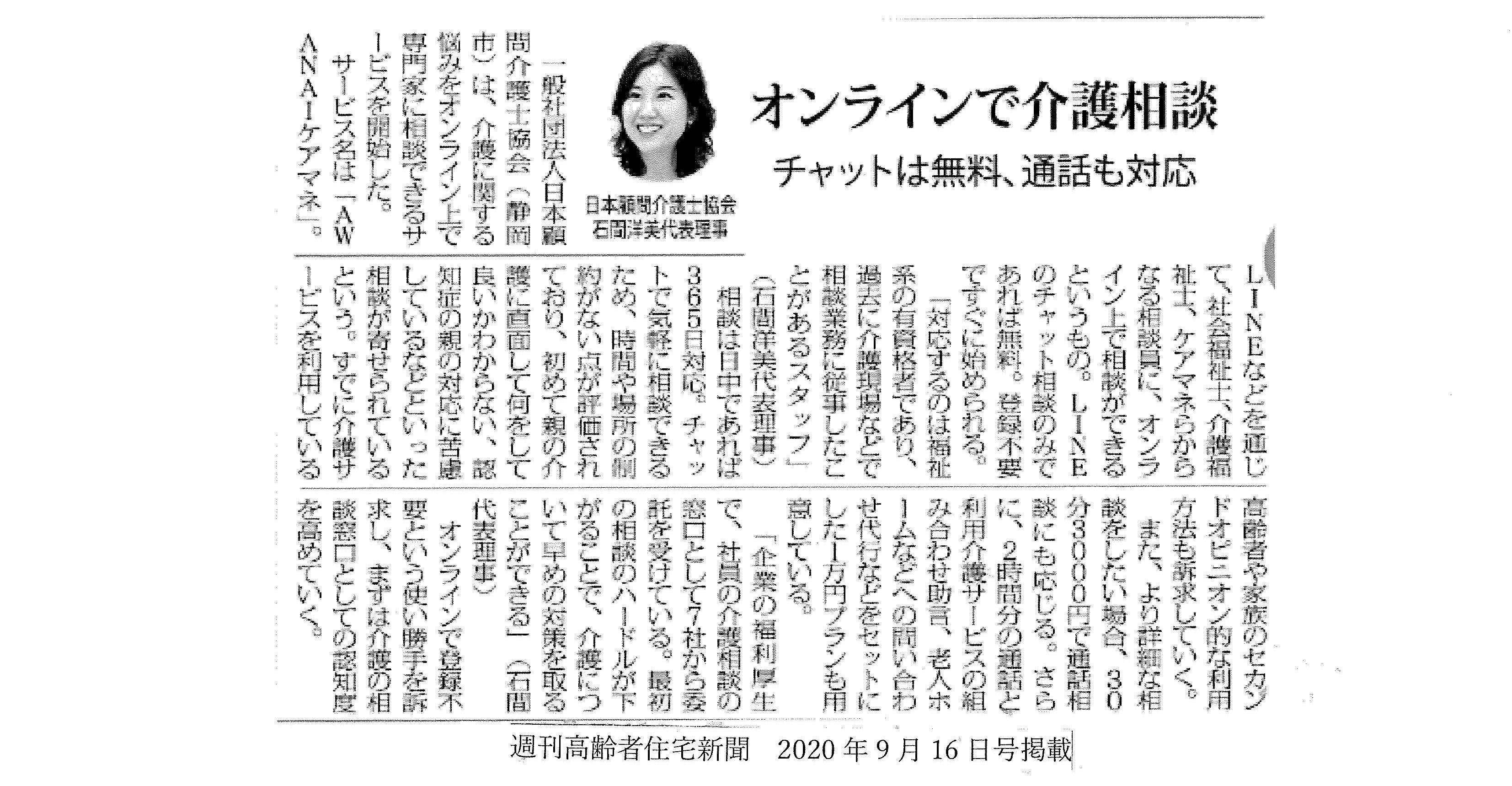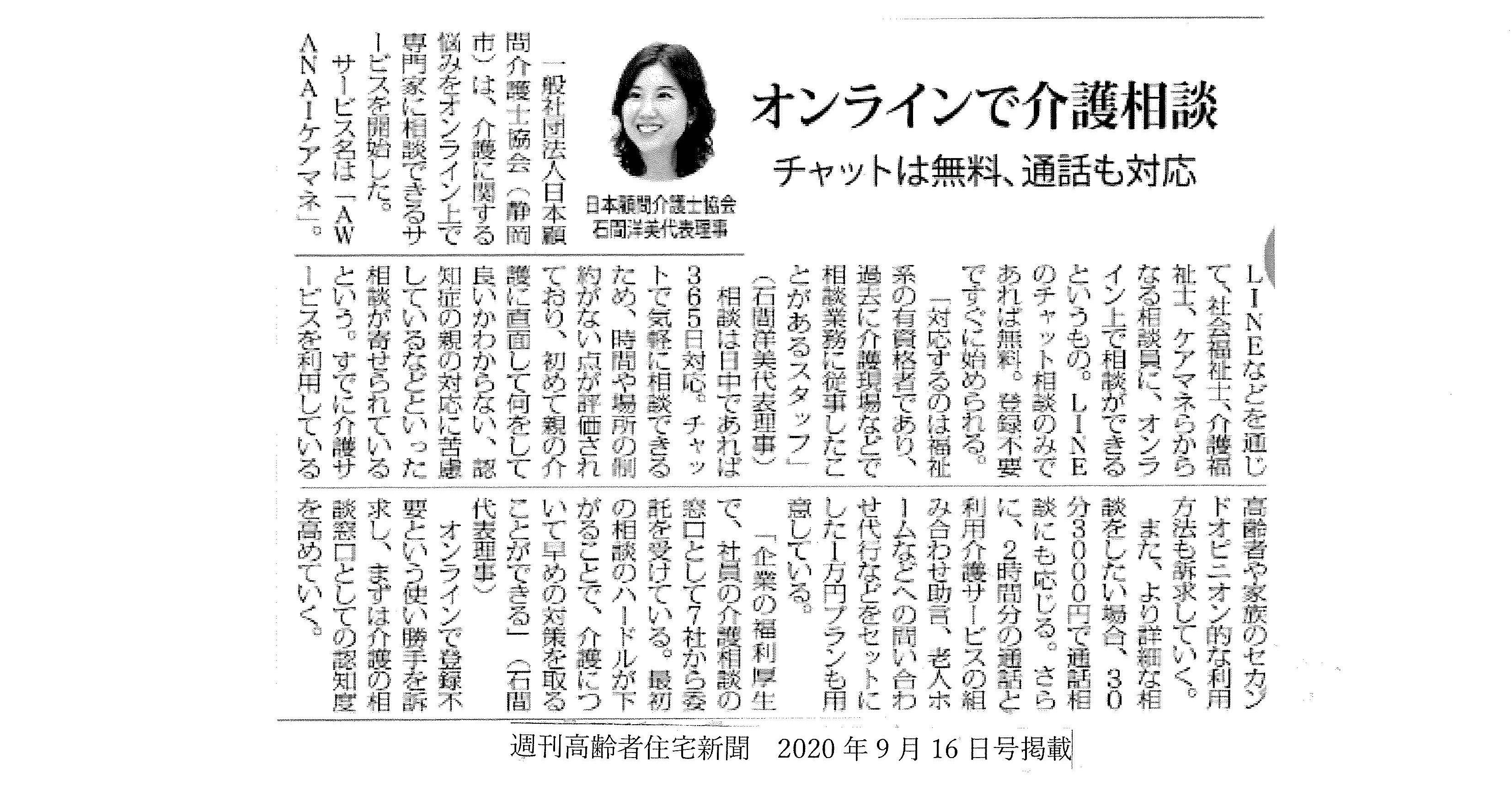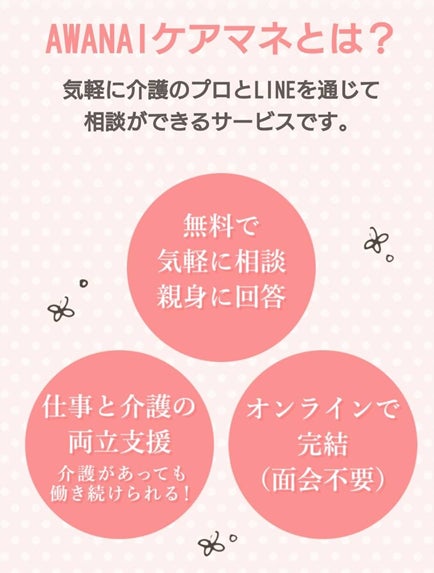 一人でも多くの方に安心感を提供したく、法人向けの福利厚生として介護の相談窓口である「顧問介護士」を提案しているなか、多くの出会いがあり、LINEを活用して介護相談できる「AWANAIケアマネ」というサービスがカタチになりました。感謝しています。