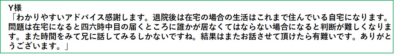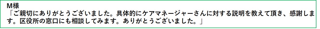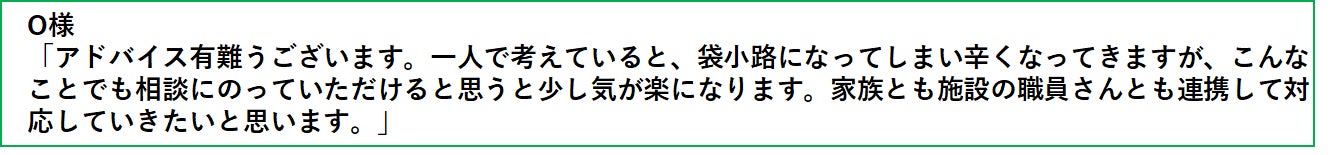 日々全国からご相談を受けているなか、一度ご相談された方がリピーターとしてご相談くださるケースも多いです。また、地域包括センターやケアマネージャーとお話する前に予め介護知識を得たいと質問くださるケースもあります。基本的な知識をもってケアマネージャーと話ができることが適切なサービスを選択するために大変役立ったとの声もいただきました。