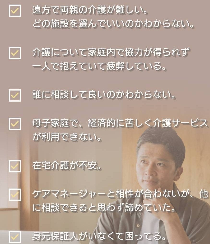 即優先個別相談(オンライン会話2時間分)や代行電話サービス、適切なサービスの組み合わせ、介護施設のご提案など充実の内容となっております。