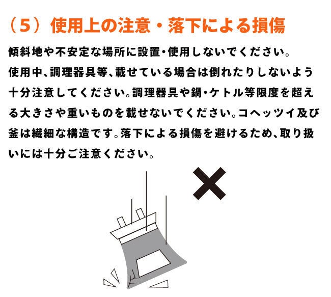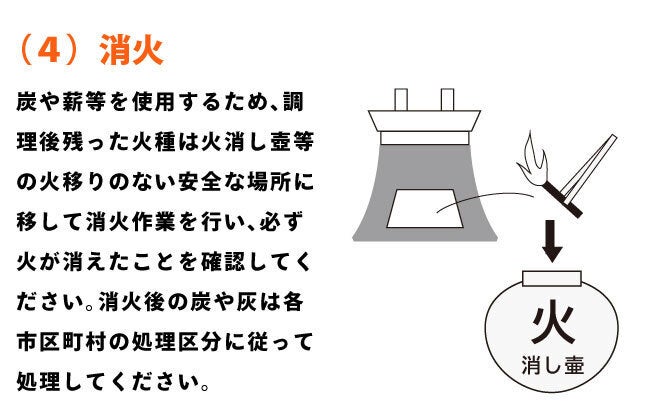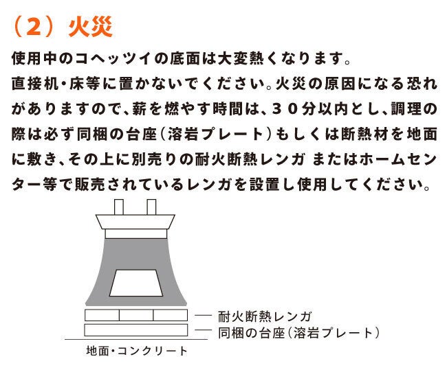 直火で調理等行う際は必ず、同梱の台座もしくは断熱材を地面に敷き、その上に