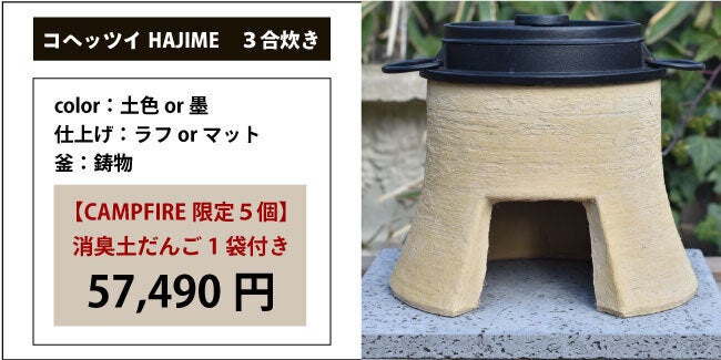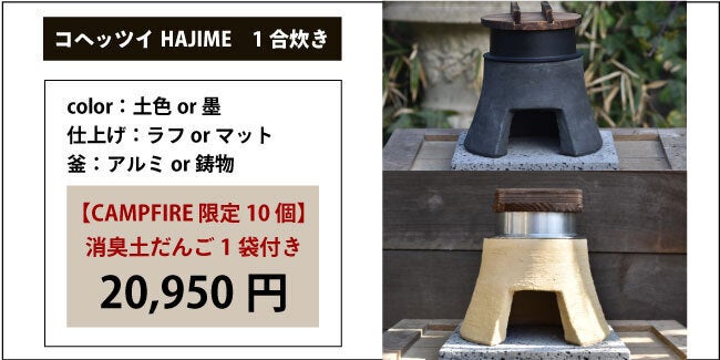 2021/04/29 09:21プロジェクト最終日となりました!ここまで来れたのも、応援してくださった方がいるからだと感じています。このプロジェクトは地球の未来に対して、若手職人達へ技術の継承や土を活かしたプロダクト開発、環境問題にも大きく繋がるものとなっております。「私たちが創る塗り壁への想い先は、人間が手を加えた素材をより良くして還す」この取り組みを活かし、地球にも人にも優しい土のプロダクト「コヘッツイHAJIME」を製作しました。コヘッツイHAJIMEは、はじめて「かまど」を使用する方でも手軽で簡単に扱えるエントリーモデルです。ご飯を炊くだけでなく、燻製やダッチオーブンや焼き網を使用した調理などこだわりの時間をお愉しみいただけます。【コヘッツイHAJIMEで炊く】1合あたり水:200ccでかまど炊きのご飯をお楽しみいただけます。【コヘッツイHAJIMEで焼く】【コヘッツイHAJIMEで燻す】燃料として薪・炭・固形燃料・ガス缶(CB缶・OD缶)を使用することが出来ます。固形燃料であれば、安全で室内でも使用できるなどそれぞれの楽しみ方があります。おすすめは薪です。次から次へと薪をくべて炎を自分でコントロールする醍醐味、ご飯を自分の器量だけで炊き上げる楽しみが味わえます。コヘッツイHAJIMEでアウトドアに挑戦してみたり・・・薪で火をおこし、炎の揺らめきを愉しんでみたり・・・ちょっとしたコーヒータイムを味わってみたり・・・人それぞれの「コヘッツイライフ」をお愉しみいただけます。プロジェクト最終日も頑張ります! もっと見る