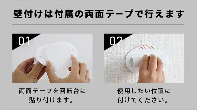 ※両面テープを使用して壁などに取り付ける場合、材質によっては壁や壁紙を破損する可能性があります。