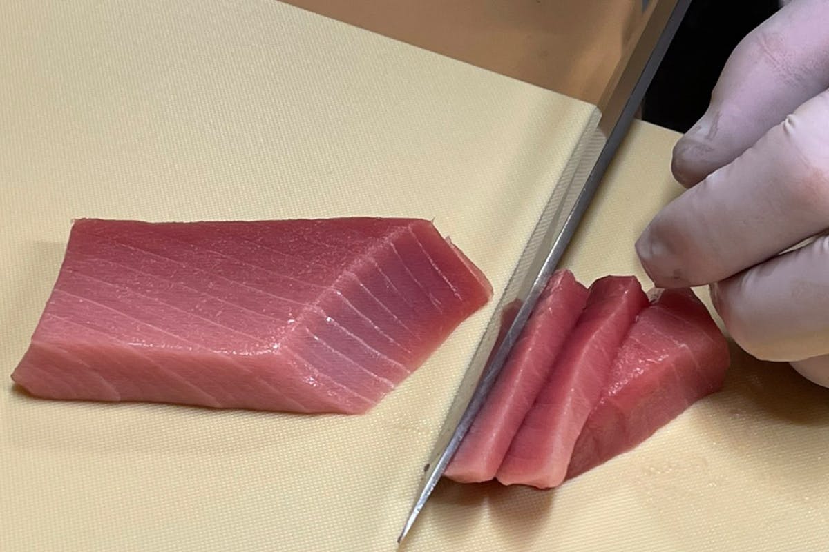 筋目に対して直角に包丁を入れると、切りやすく食べやすいネタになります。