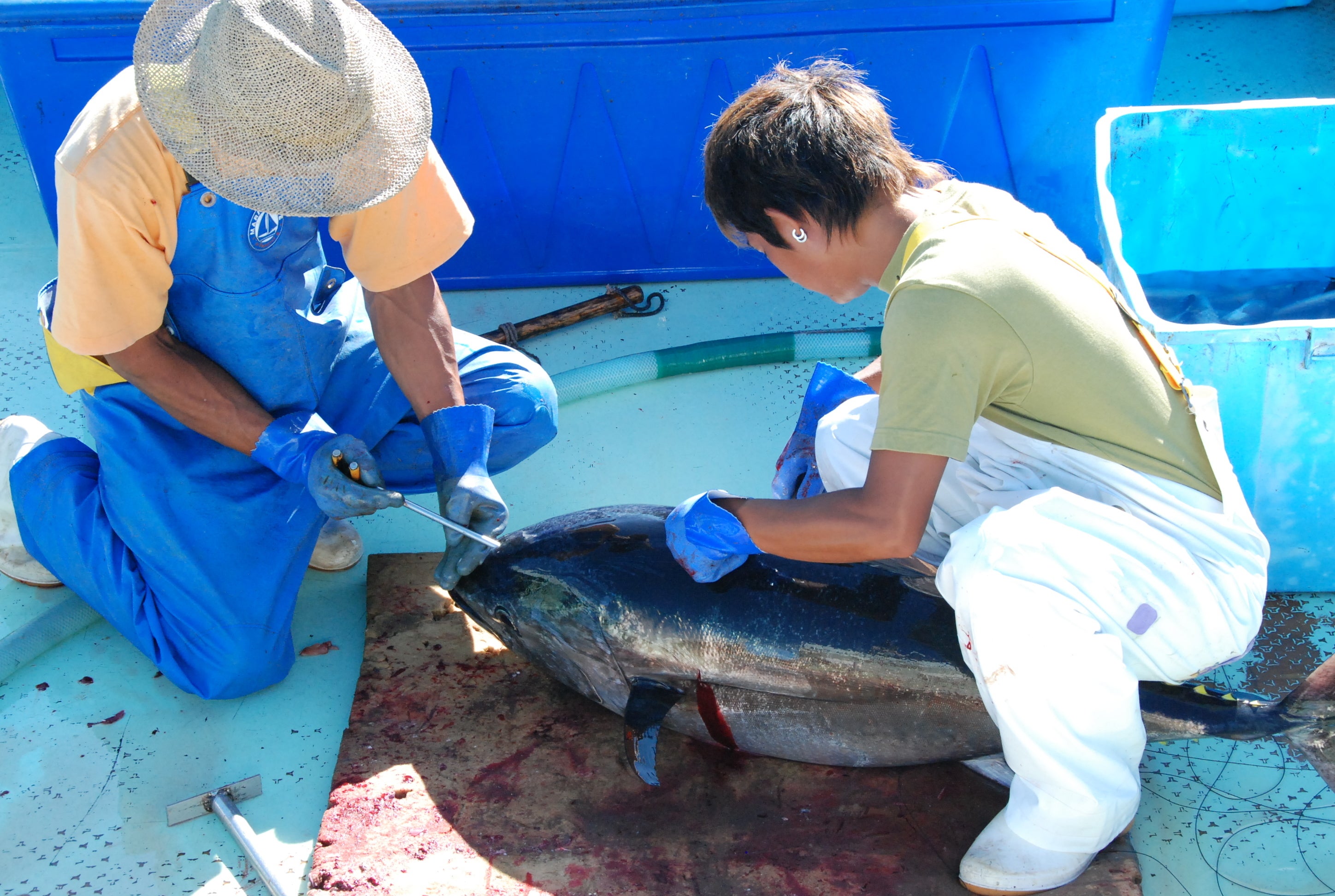 ③船上にマグロを揚げ、血抜き、神経破壊処理を施します。