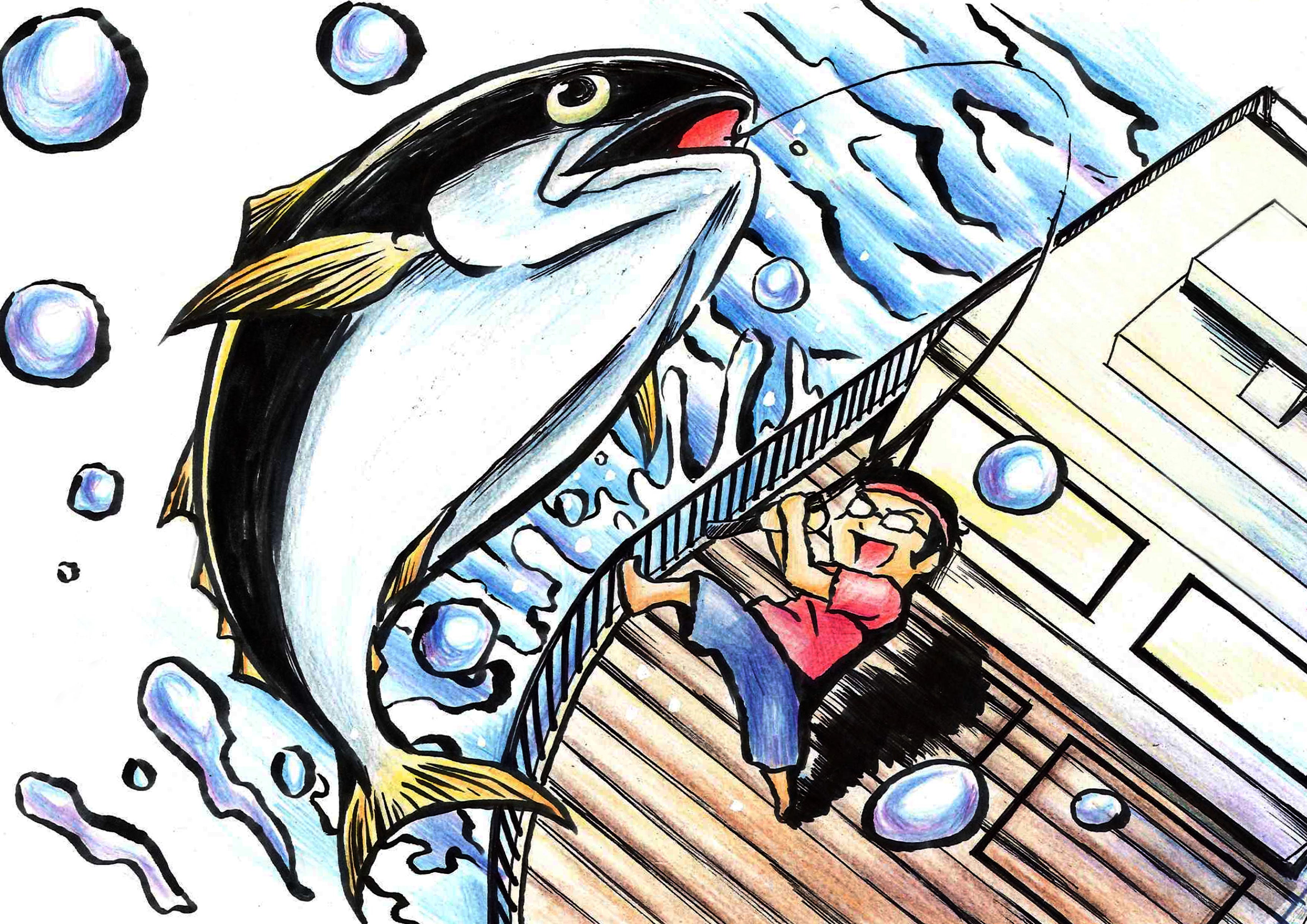 ①マグロを釣り上げる仕掛けです。釣りの部分は企業秘密です。