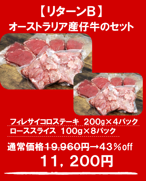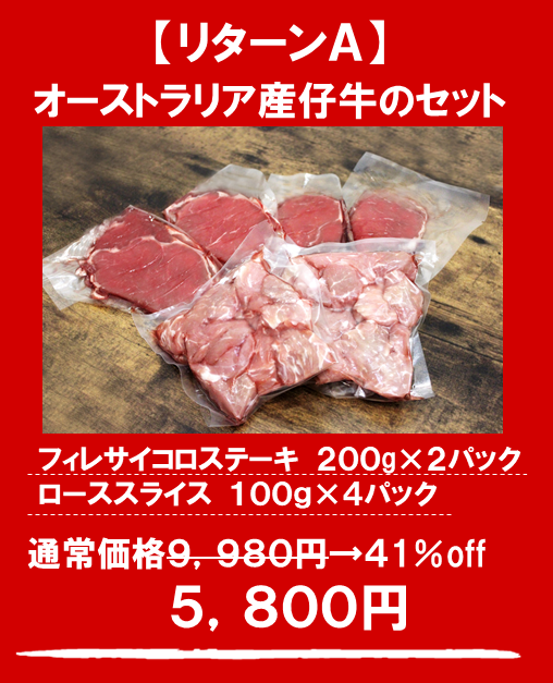 ご支援の御礼品(リターン品)としてオーストラリア産子牛肉のフィレをサイコロステーキにオーストラリア産仔牛肉のロースをスライスに加工して、皆様のご家庭へ宅急便でお届けいたします。ご家庭でオーストラリア産の仔牛肉をお召し上がりください。