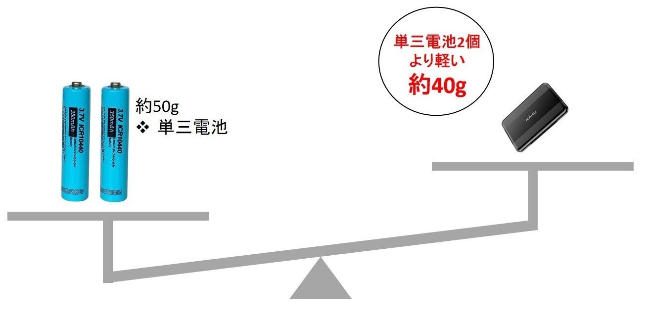 重さはたったの 40g! 単3アルカリ乾電池2本よりも軽いのです。
