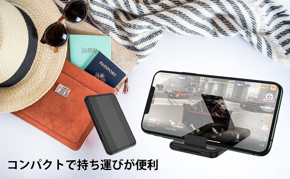 コンパクトなスマートリンクカードは、フタを開くと約 70 度になり、そのままスマホスタンドとして使えます。