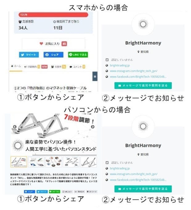 当プロジェクト公開期間中にシェア内容をメッセージにてお知らせ頂くことが条件となります。