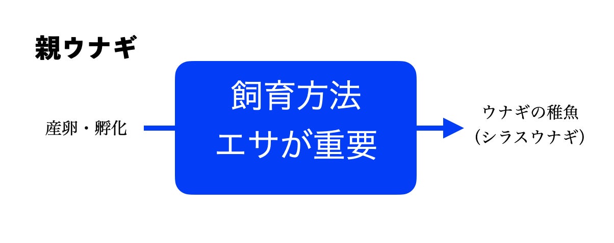 この【孵化〜シラスウナギ】までの間の飼育方法(特にエサ)に着目をしてきました。この方法によって、飼育率を高めることに成功しています。