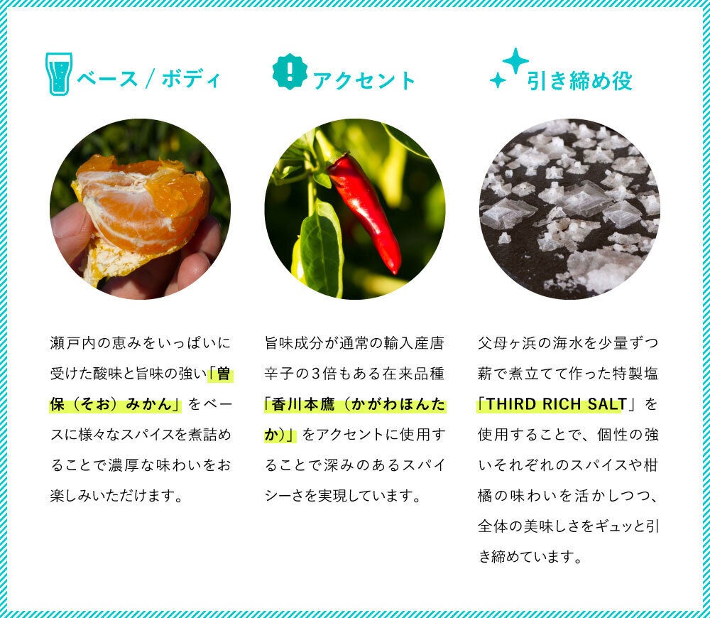 グラニュー糖(国内製造)、みかん(香川県産石地)、コーラナッツ、カルダモン、クローブ、オールスパイス、シナモン、塩(香川県父母ヶ浜産)、黒胡椒、香川本鷹(香川県三豊市庄内半島産)、レモン果汁