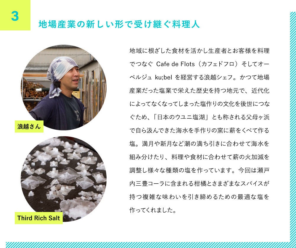 「そういえば、この塩を作っているシェフはかつて地場産業だった塩作りの文化を途切れさせたくないという想いからこの塩作りを始めたんだったな・・・」
