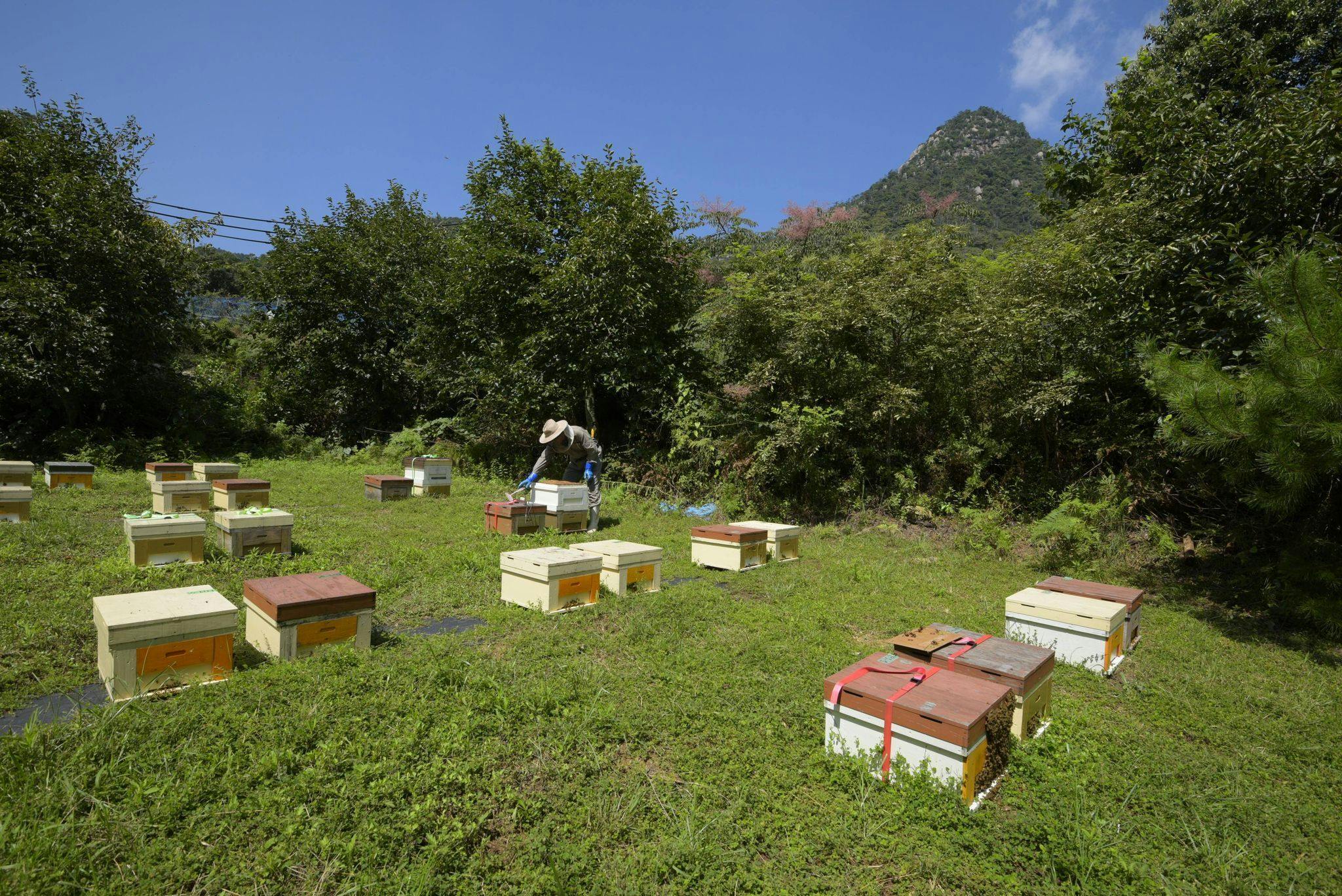 宮島農園内には5月下旬から7月下旬までの約2ケ月間、西洋ミツバチの巣箱が設置されています。農園を中心に半径2〜3km圏内の弥山原始林に咲く樹木の花々から、この土地ならではの蜂蜜が集められてきます。