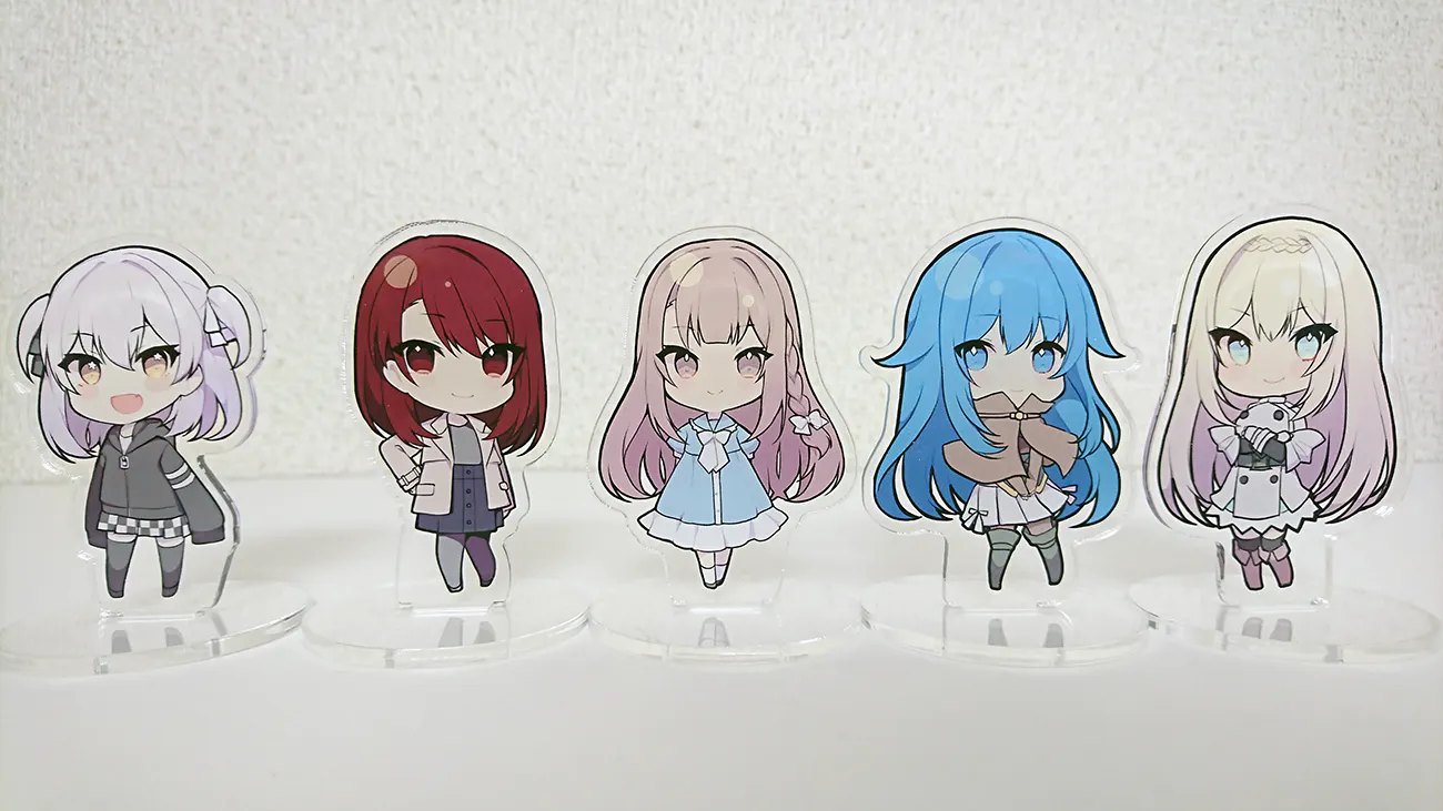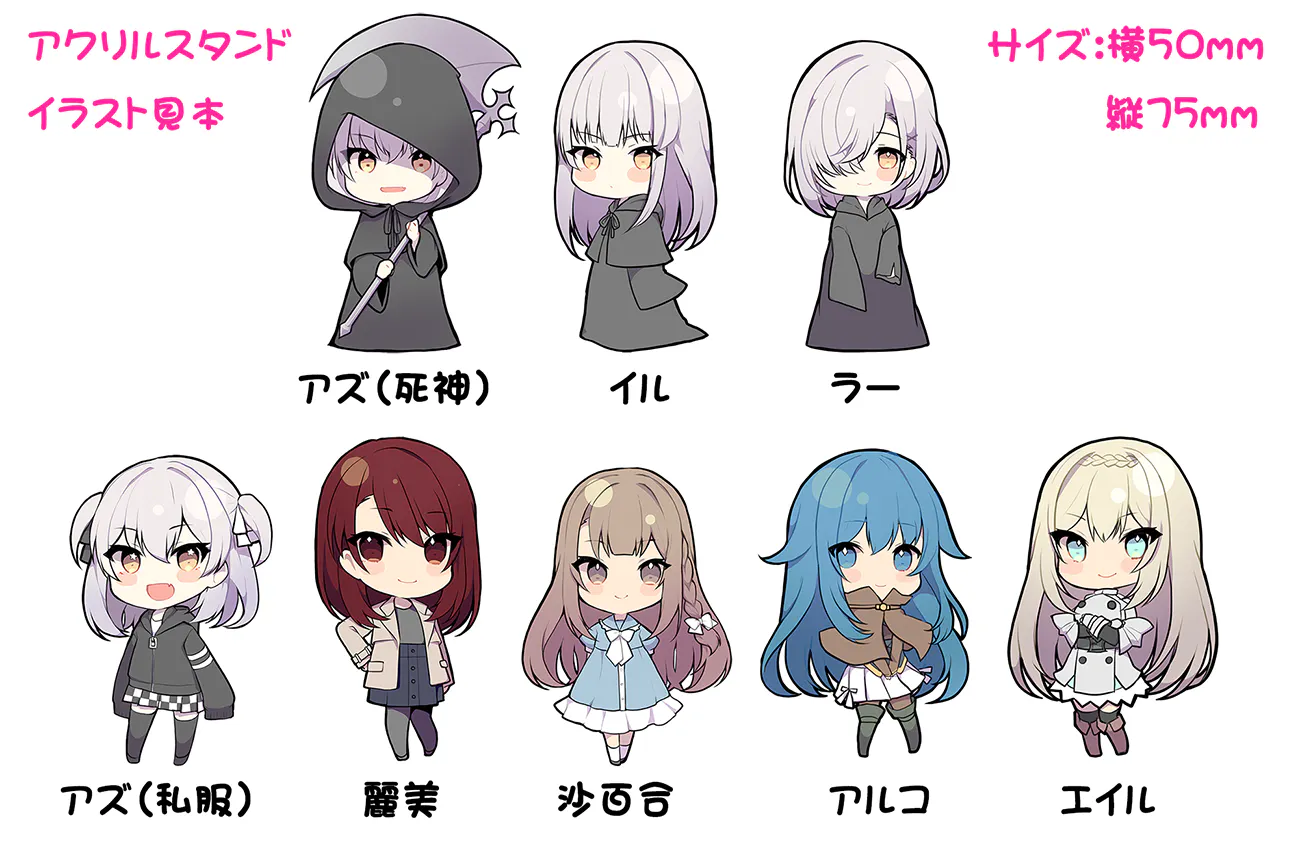 雨雫様描き下ろしSDイラストのアクリルスタンドセットになります。(横50mm、縦75mmサイズ、片面印刷)