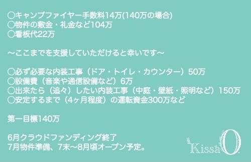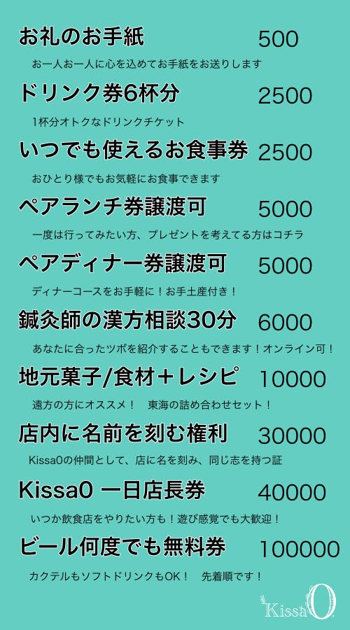 2021/12/14 12:34ご報告が遅くなり申し訳ござません!Kissa0が12/1にオープンしました!オープンしてすぐは、全く想定していない事態が沢山起きてしまって、かなりバタバタしておりましたがやっと落ち着きましたいまやっと支援してくださった皆様にお礼の言葉とリターンをお一人ずつ丁寧にお送りしているところです。お食事券を購入された方については、メールでチケットの画像をお送りして来店時にその画像を拝見していただくスタイルです。また、ほかの商品を購入している場合は、ご自宅まで郵送させていただきます。まだまだ未熟ものですが、誠心誠意努めてまいりますので今後ともよろしくお願いいたします! もっと見る