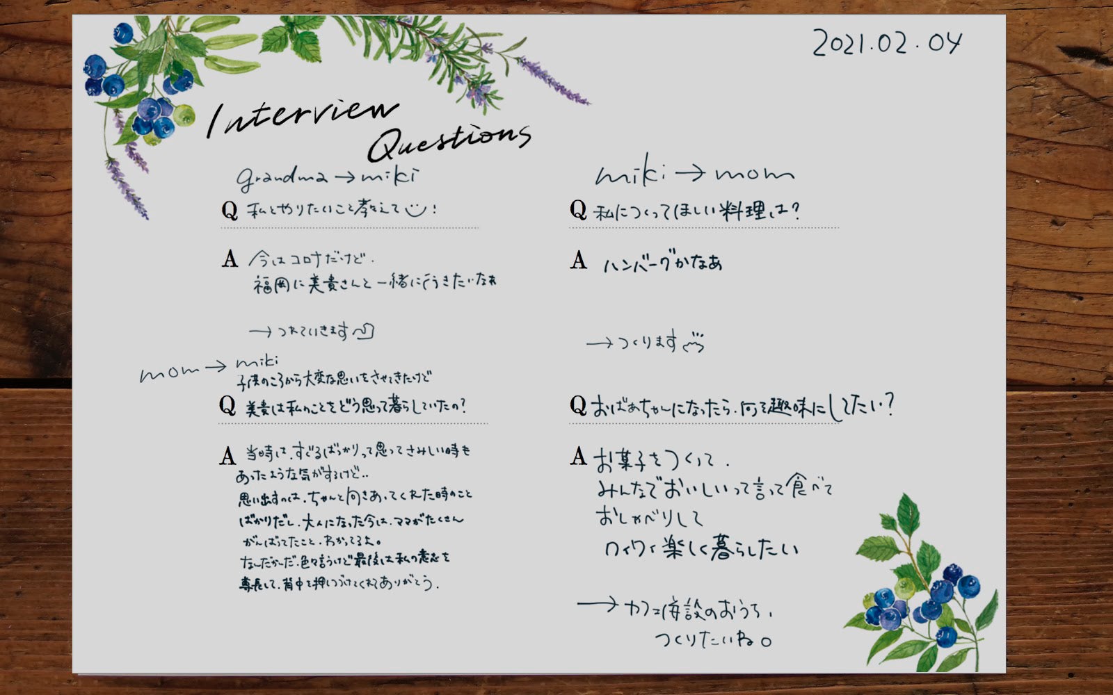 家族と話すって気恥ずかしい瞬間が多かったりしますが、戸籍上というより、その時間があってこそ、歩幅の合う家族でいられる気がします。目の前の家族と気持ちを交わす時間を、ノートを通して増やしていただけたら嬉しいです。」