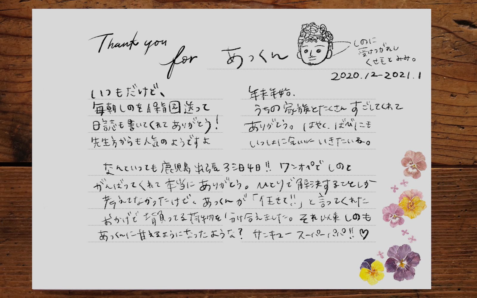 このノートを一緒に綴る中で、なんでもない日常を少し引きの目線で見れるようになり、“当たり前”だと思っていたことの有り難みにお互い気付けたり、今この瞬間がいつかたまらなく愛しくなる特別な時間なのだろうなと実感できるようになりました。