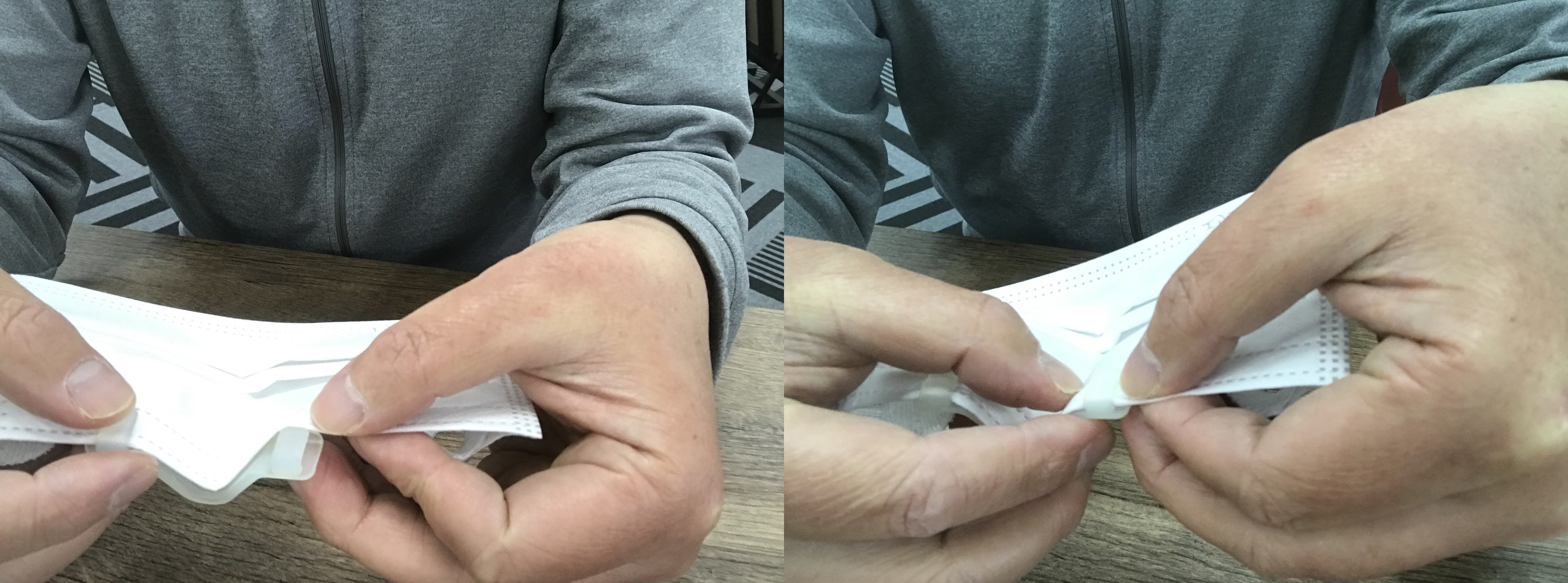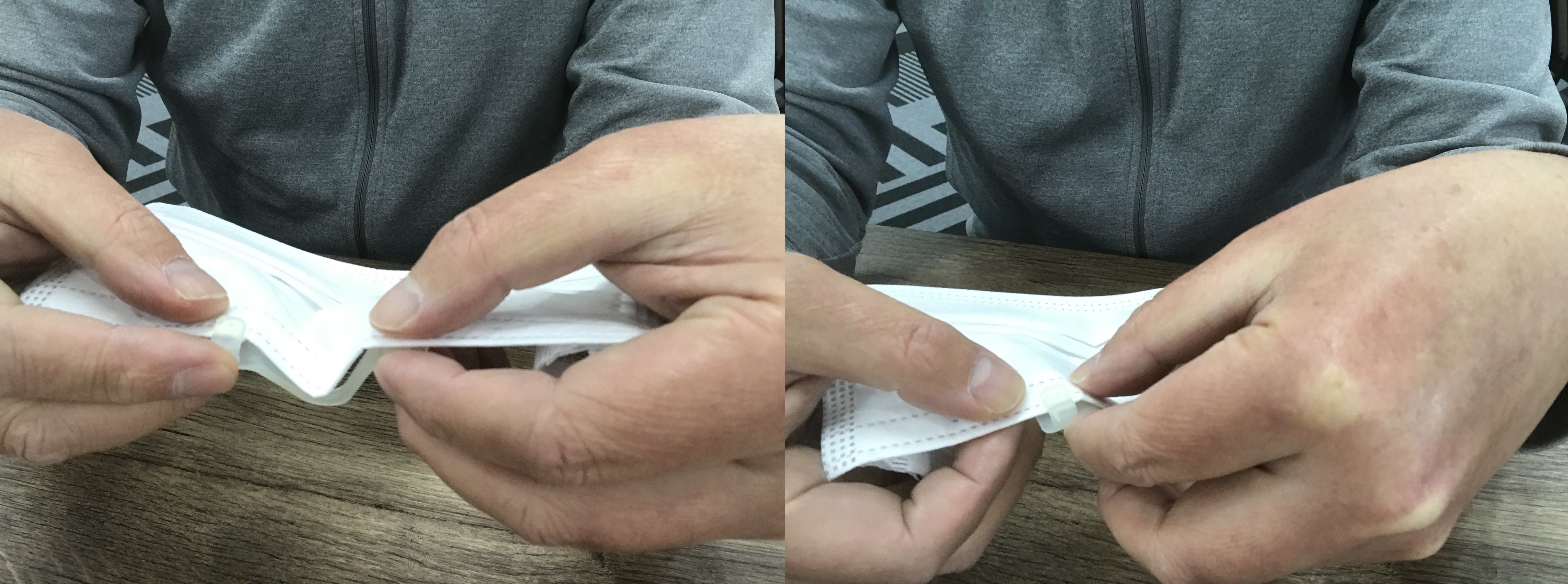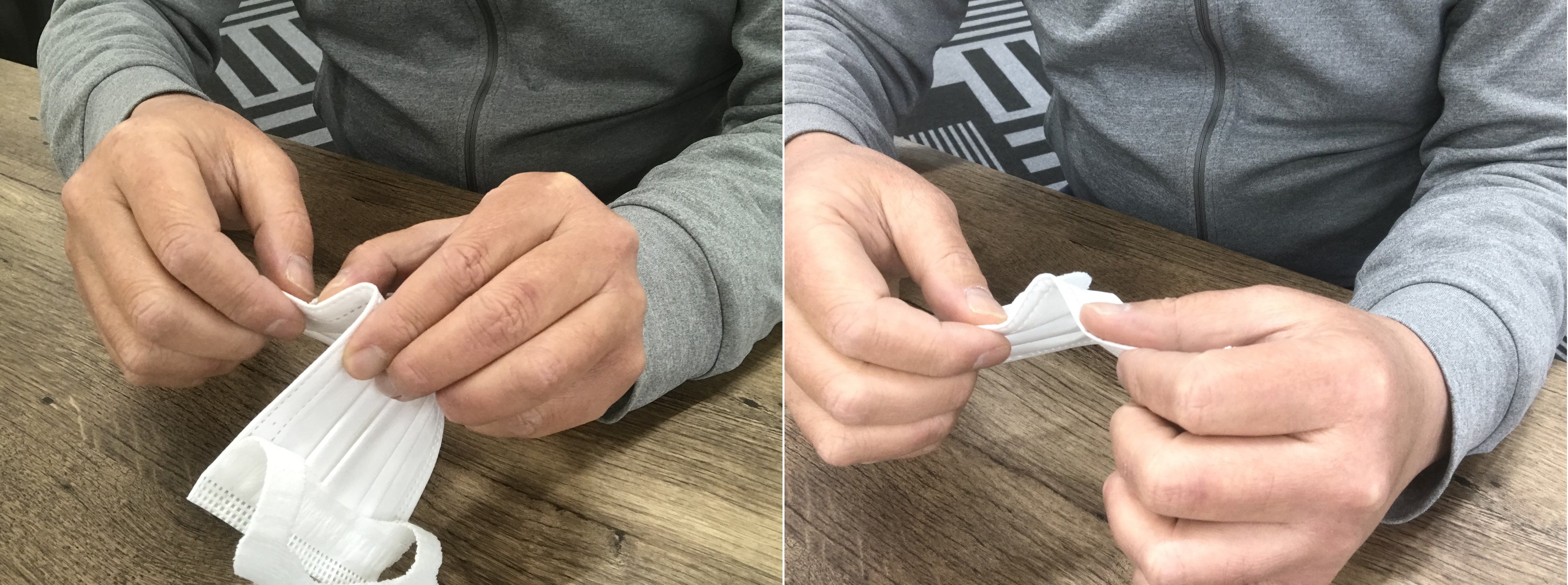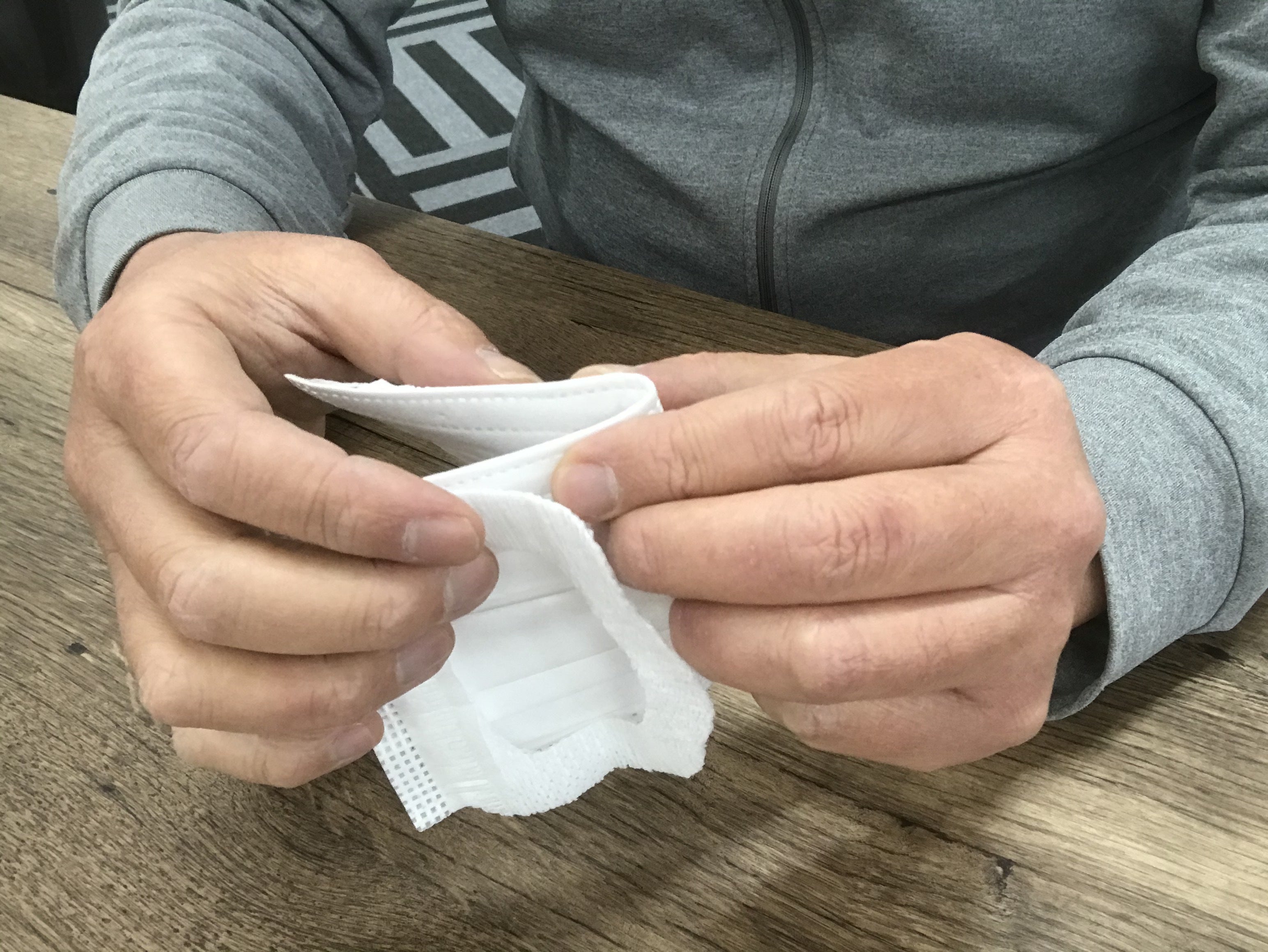 ①手洗い後、不織布マスクの表裏・上下を確認し、鼻が当たる所を頂点に内側(頬側)に、ほぼ180度に近いくらい折ります(器材のプラスチックを半分に折り曲げる感じです)。力一杯折り曲げる必要はありません。