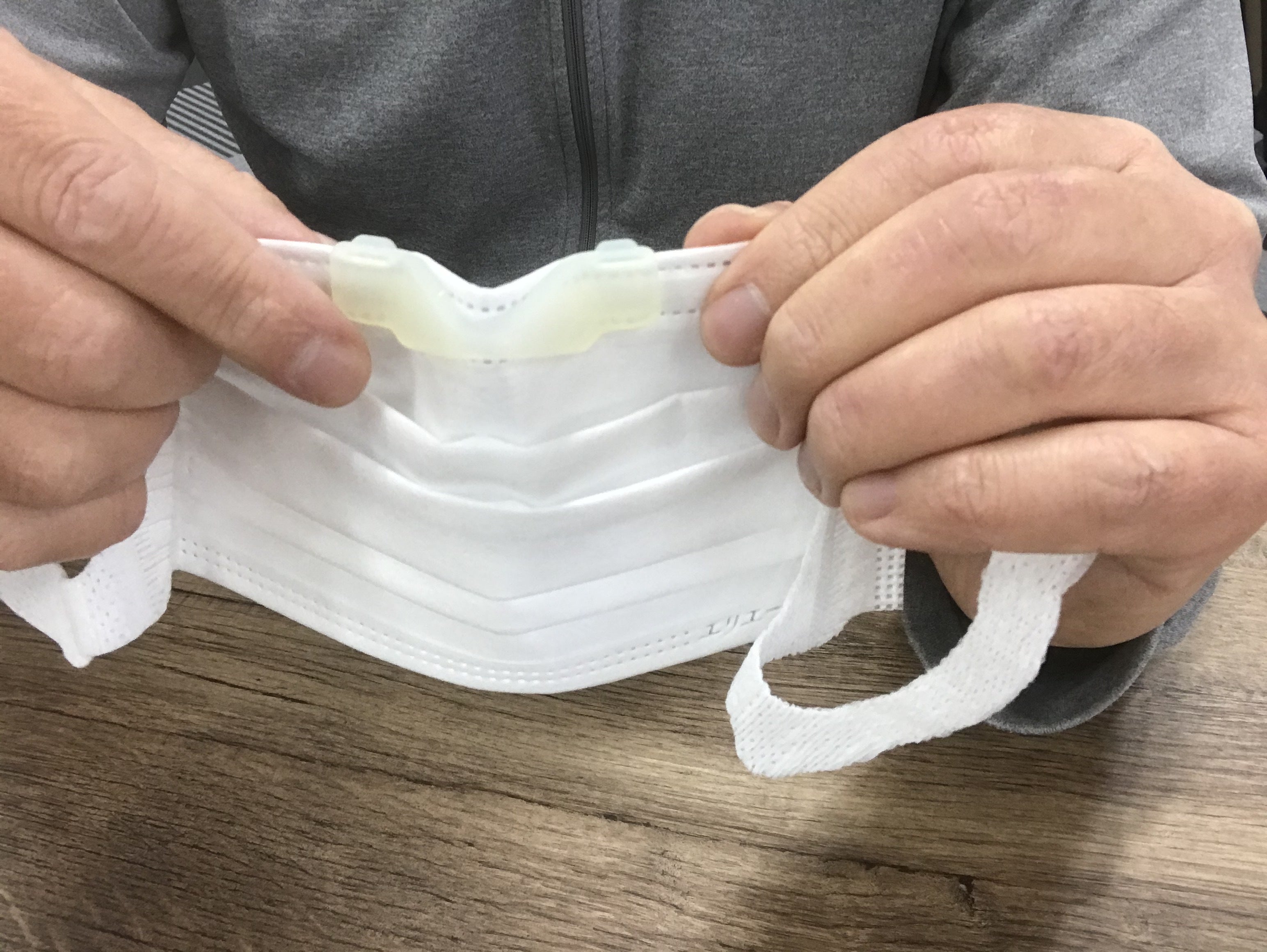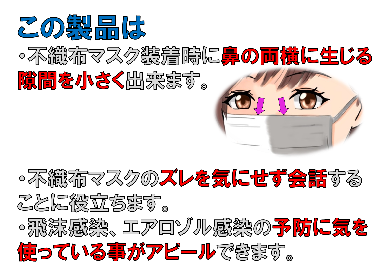 今回開発した製品は、不織布マスクの鼻に当たる部分にある器材(ノーズフィッターとかノーズピース等と呼ばれています)の形状維持を補完する補助器具です(医療機器ではありません)。