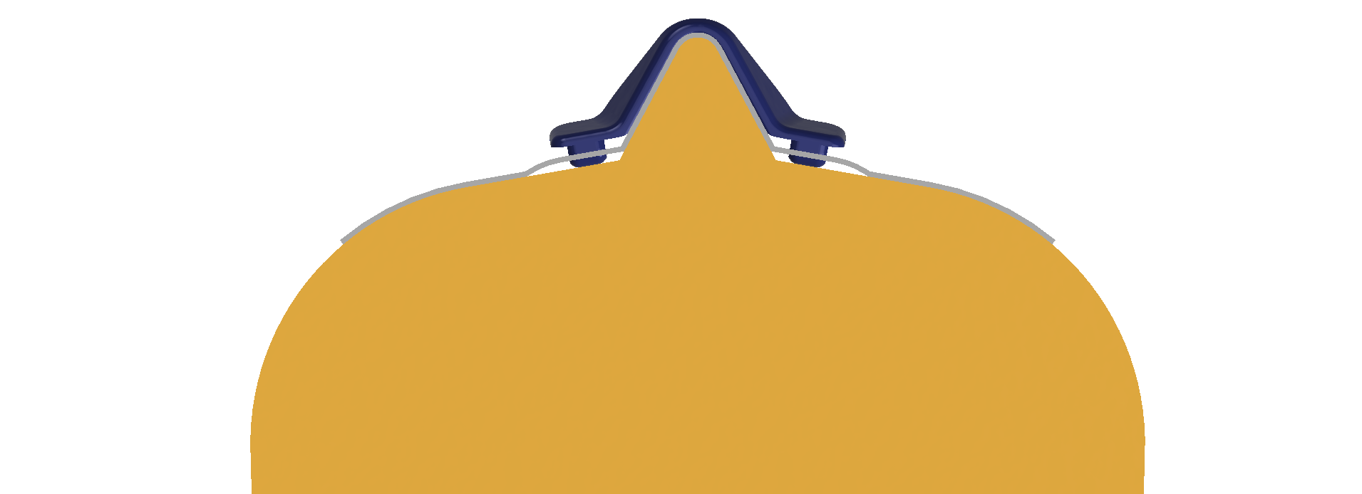 これが今回ご紹介している器具(紺色の部分。わかりやすくする為の色です)を使用した時の不織布マスクの形状です。隙間はかなり小さく出来、時間が経っても形状は変わりませんので、多少喋ったくらいでマスクがズレる事も少なくなります。御客様対応などでどうしても対面になる方や、少しでも効果的に不織布マスクを装着しておきたい方などに、御安心を感じて頂けると思います。