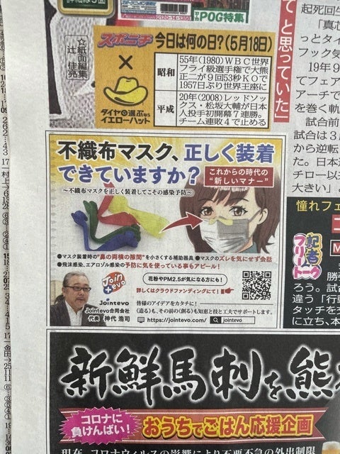 2021/05/19 03:205月18日のスポニチ九州版に、このクラウドファンディングについての広告を掲載頂きました。大谷選手と同じ紙面に載るなんて、光栄です! もっと見る