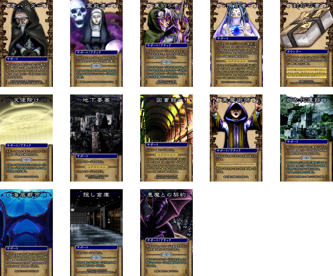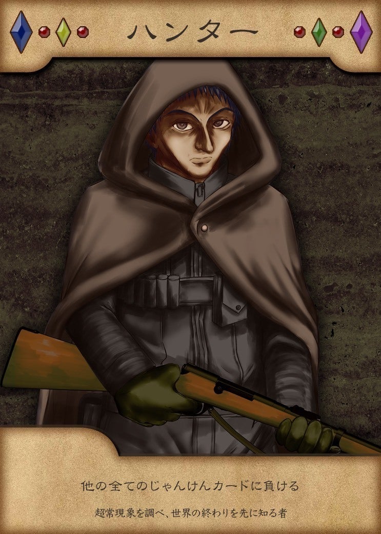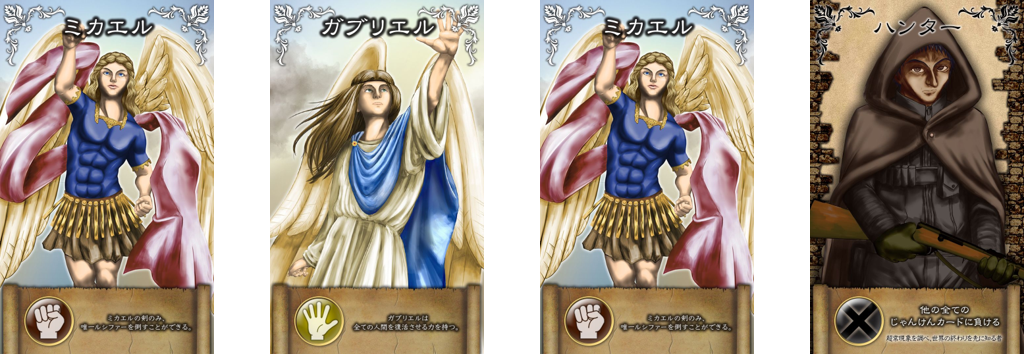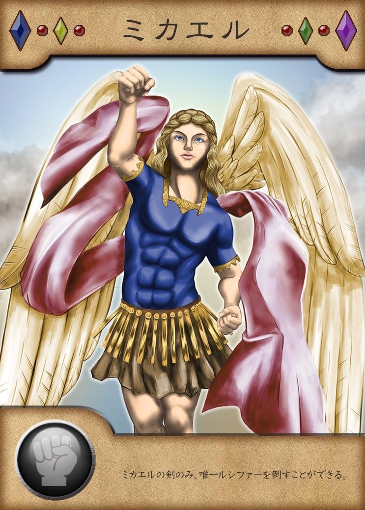 2021/03/08 12:00天界じゃんけんについて、ゲームマーケットのブログへ投稿しました!以下の内容です!↓ルシファーの復活ミカエルとの対決そして、世界の終末 それを阻止するために立ち上がるハンター天界じゃんけんは、2人用のガチンコカードゲーム 2人で共有した山札を使用します。 4種類のじゃんけんカードが入っていますが、ハンターは他の全てのじゃんけんカードに負けてしまいます。 しかし、天使へ対抗できる武器、聖油を使うことでじゃんけんに勝つことができます。ゲームの進行は、交互にターンを行い、後攻のターン終了時に、お互いの手札にじゃんけんカードがあれば、じゃんけんフェイズへ。 じゃんけんに先に3勝したら勝利! 手札から使うサポートカードは、山札、捨て札、相手の手札へ干渉するカードなどで、ハンドの操作を行います。 その中で、自分に有利な状況を作り出して、じゃんけんへ勝つことを目指します。 <ゲームの世界> 「ルシファー」は、地獄へ封印されていた。ルシファーは全ての悪魔の親玉であり、その下部の悪魔たちにより六十六の封印が破られ、地上へ降臨。「ミカエル」は、ルシファーを説得するが、ルシファーは聞き入れず、「ガブリエル」も仲裁に入るが失敗。ルシファーは、完全に力を取り戻していないため、ミカエルから身を隠して力をためている。 一方、ハンターたちは、一般人ではなく、詐欺や泥棒をすることで普段の生計を立てている人たちである。そして、人々を幽霊や悪魔などの怪物から守っているのである。ハンターたちは、六十六の封印を守るために必至に動いたが、悪魔達の数の前になす術はなくルシファーが復活。 ルシファーを再び地獄へ封印するために動き出す。 もっと見る