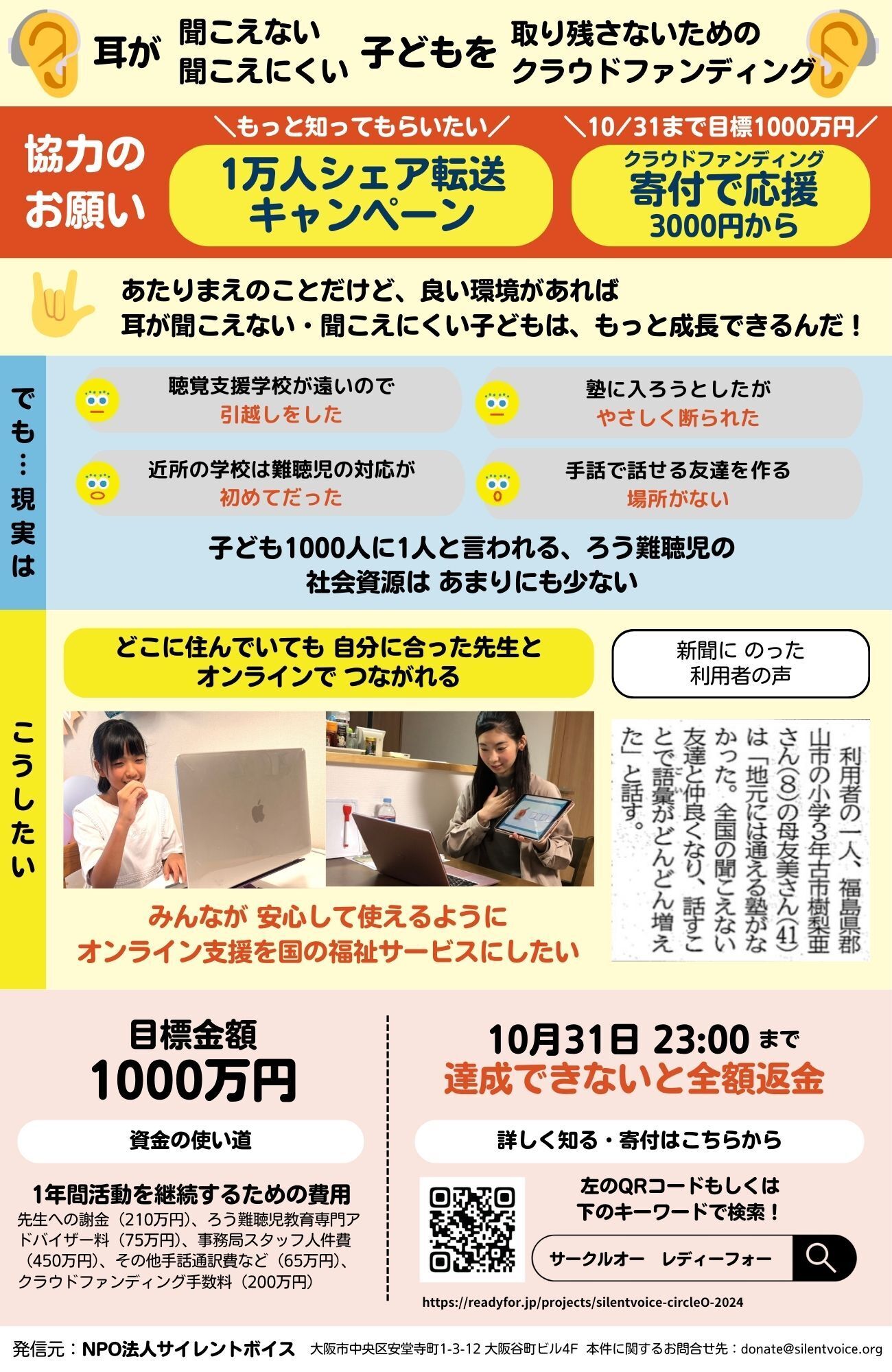 サイレントボイスは、耳が聞こえない・聞こえにくい子ども(ろう難聴児に)への教育事業を大阪府で拠点型、そして全国を身近に支援環境のないろう難聴児対象にオンライン型で、展開しています。そのサイレントボイスが、オンライン教育事業「サークルオー」の事業継続と制度化に向けた活動費を募る、クラウドファンディングに10月31日まで挑戦しています。