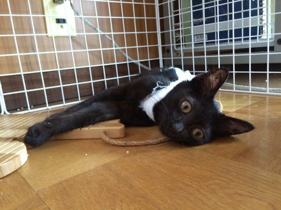 8/17、入院した6日前より体重が200gも増えて1.3kgになって、退院しました! 元気いっぱい走り回り、おもちゃでしつこく興奮し(https://youtu.be/uh79Z9EWljk)、トイレ砂で大興奮(https://youtu.be/UL7SaqqyrjU)したあとうんちして、ものすごい勢いで砂をかいて周りを砂だらけにしました(https://youtu.be/cv-6ljUqWRw)。 これでこそ子猫!こんなパワーは、手術前にはありませんでした。見た目どおりのか弱い子猫だったのですが、元気で遊び好きで人見知りしない、頼もしい子猫に変身です☆初診ですぐに病気を見つけてもらえて、そして覚悟を決めて手術を受けさせてよかった。 10分ほど遊び回ったころ、ふと目にとまったカリカリをおもむろに食べ、おもむろに水を飲み、保冷剤枕の上に寝そべって休憩タイムに入りました♪ 数日後に抜糸のため通院しますが、もう普通の子猫と同じように過ごして大丈夫だと思う、との獣医さんのお話だったので、さっそく里親探しを始めます。(20日の譲渡会に参加するつもりです。したが、申し込みが間に合わず、本人を連れての譲渡会参加はまた後日からにすることになりました。) あちこちでお願いしている寄付ですが、現時点で合計111,500円にもなりました。たくさんの方に応援の言葉もいただけて、金銭的に助かるだけでなく、とても勇気づけられています。本当にありがとうございます!!! 手術と入院の費用は15万円を少し超えました。9月末まで、ご寄付のお願いは続けていこうと思います。引き続き、シェアなどでご協力いただけると幸いです。
