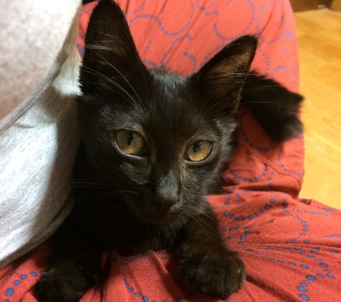 うちに来て1週間が経ちました。 当初より食べる量が増えて(カリカリ25g/日→40g/日)、少し体が大きくなりました。 ですが、呼吸は約100回/分もあるままです。 我が家の先住猫とは別の部屋のケージの中で過ごしていますが、夜には少しだけ部屋の中を自由に歩かせて様子を見ています。 普通の子猫と同じに、遊びたい気持ちも甘えたい気持ちもたっぷりある子です♪おもちゃを転がし、網戸によじのぼり、私の膝の上で喉をゴロゴロいわせてまどろみます。なでる手を止めると、私の顔を見上げて、なでて〜の催促。遊んでいても、抱き上げて膝に乗せると大人しくそのままでいてくれます。 あまり動き回って具合が悪くなってもいけないので、30分ほどでケージに戻ってもらいました。 3日後に手術。うまくいって、思う存分遊び回れるようになるといいね。