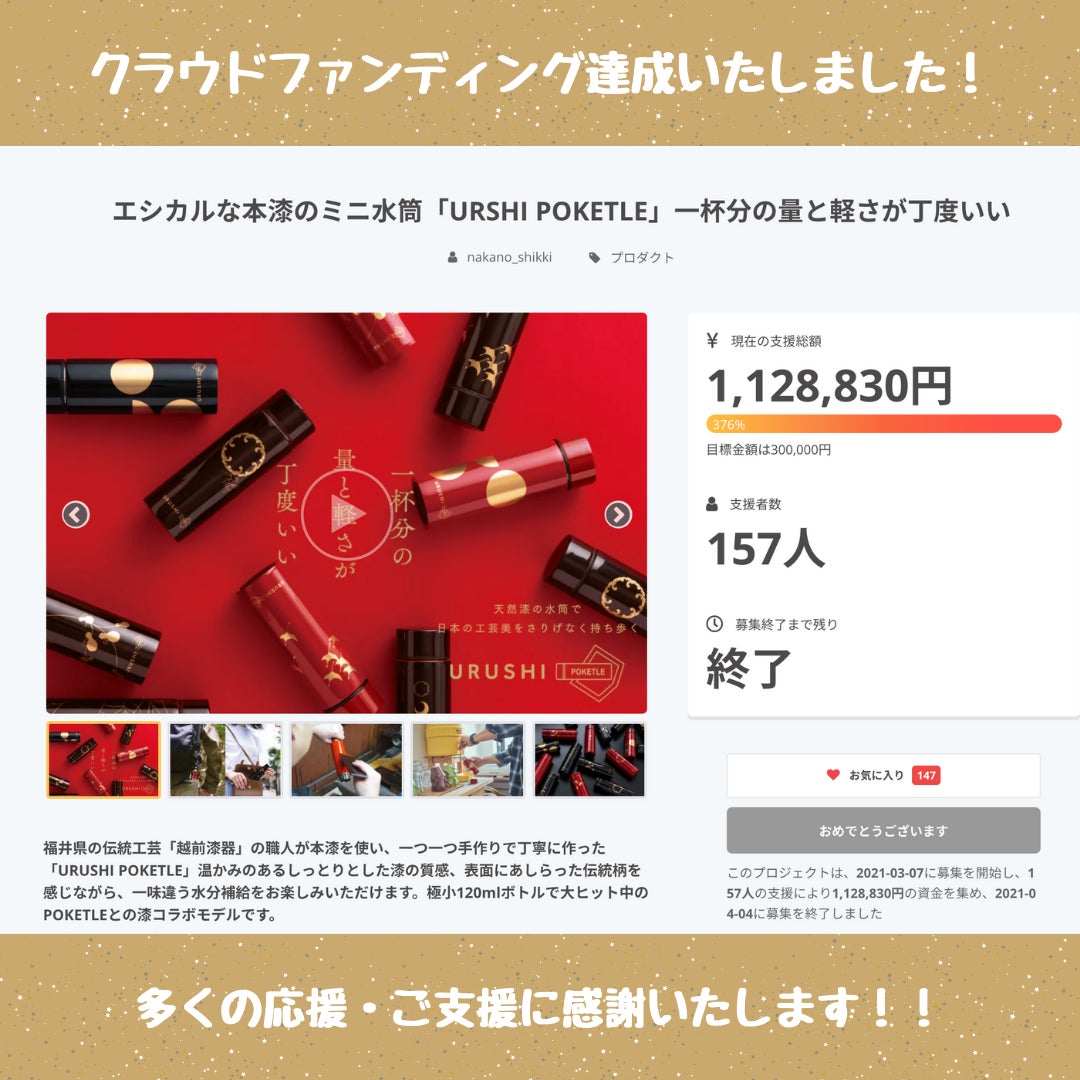 URUSHI POKETLE新モデルが登場!クラウドファンディング挑戦を開始しました!前回のクラウドファンディングで120mlサイズのURUSHI POKETLEを販売したところ、もう少し大きいものも欲しい...と多くのご要望をいただき、それにお応えして180mlサイズが新登場しました!180mlサイズもスリムで軽く、携帯性抜群です!漆塗りの面積が大きいからか、とても高級感があります。また、弊社が生業とするお茶道具の世界で使われてきた技法「一閑張(いっかんばり)」を施した特別モデルURUSHI POKETLE一閑も新登場!水筒に和紙を張り、その上から漆を塗って作られます。漆を吸い上げた和紙の絵柄の凹凸が感じられ、革製品にも似た独特の温かみのある質感を持つ、目で見て楽しい、触っても楽しい、上質感溢れる特別モデルです。毎日の水分補給に、ご贈答用にもオススメです!クラウドファンディング限定特価で販売中ですので、ぜひこの機会にご支援・応援をよろしくお願いいたします!■クラウドファンディングページはこちらhttps://camp-fire.jp/projects/view/466601