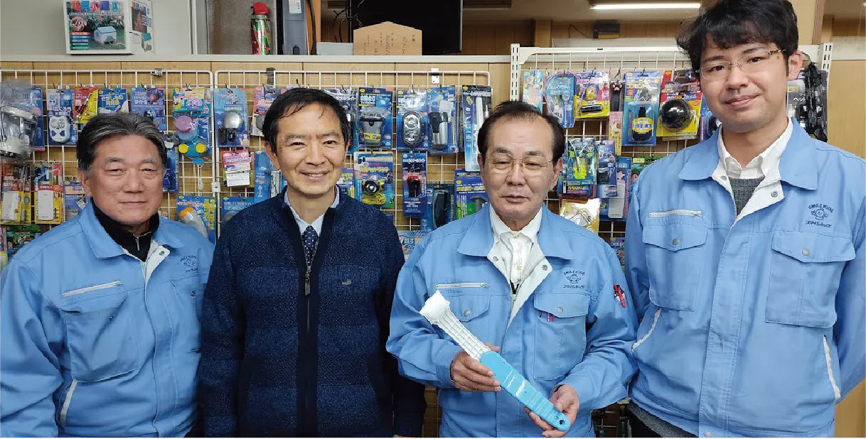 発案者の泉谷さんからバトンを受け継いだ本社の開発チーム。受け取った想いを胸に、熱い気持ちで商品開発を進めていきます。左からデザイナー東さん、原専務、機構設計の岩崎さん、取りまとめの森内課長です。