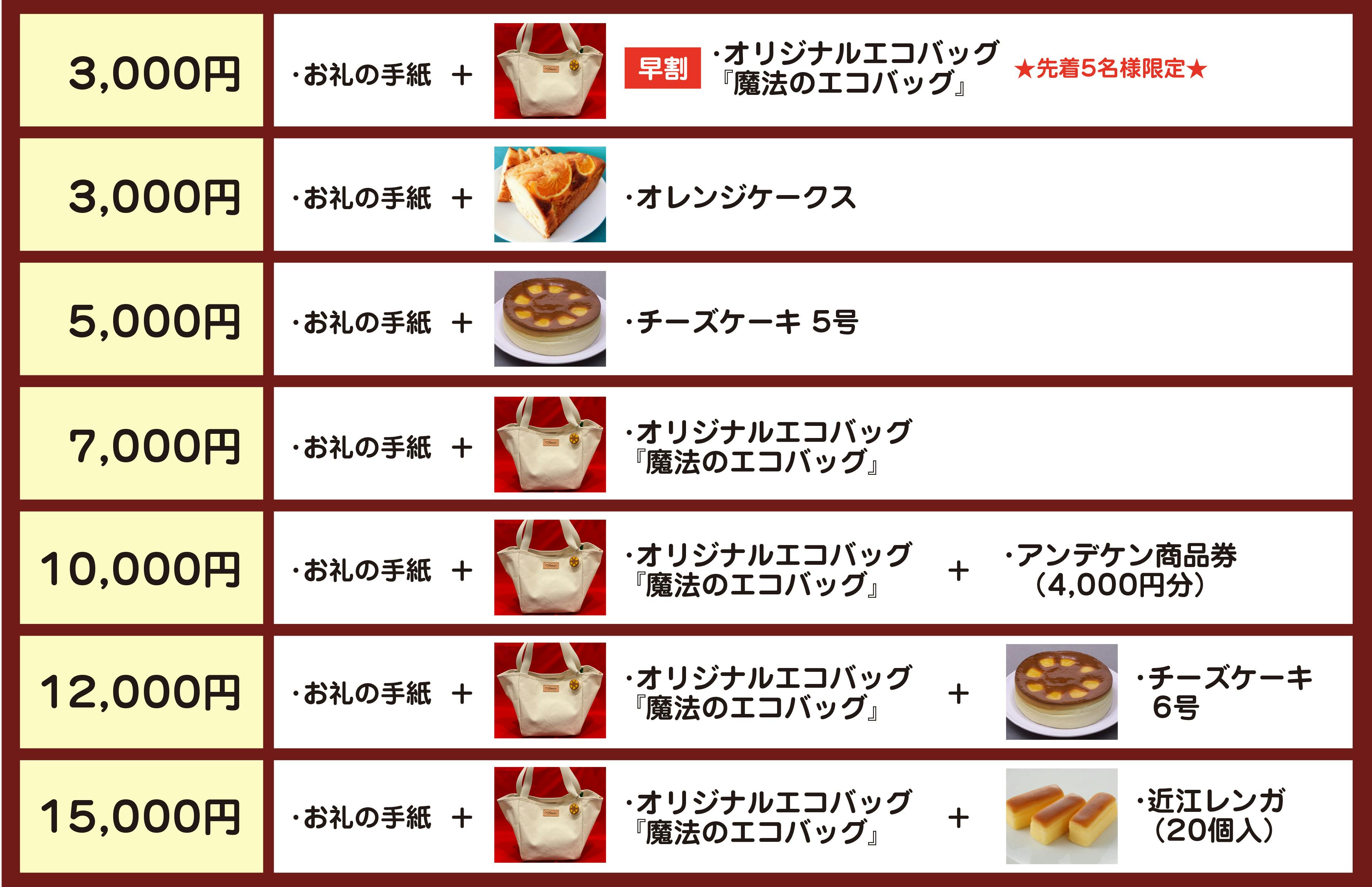 2021/06/14 11:096月18日から順次リターンの発送を開始します。受け取りの日時指定はできませんのでご了承ください。送付間違えを防ぐ為リターン品別に日を分けて送らせていただきます。【6月18日発送】・チーズケーキ5号(5000円ご支援頂いた方)・エコバック(3000円7000円ご支援頂いた方)・オレンジケークス(3000円ご支援頂いた方)【6月25日発送】・チーズケーキ6号+エコバック(12000円ご支援頂いた方)・商品券+エコバック(10000円ご支援頂いた方)・近江レンガ20個入り+エコバック(15000円ご支援頂いた方) ご支援時にご登録いただいている住所宛にお送りします。万が一返送されてしまった場合の再配達は、送料が着払いになります旨ご了承ください。ご支援いただいたリターンが全て無事みなさまのお手元に届きますように、ご協力お願いいたします。 アンデケン もっと見る