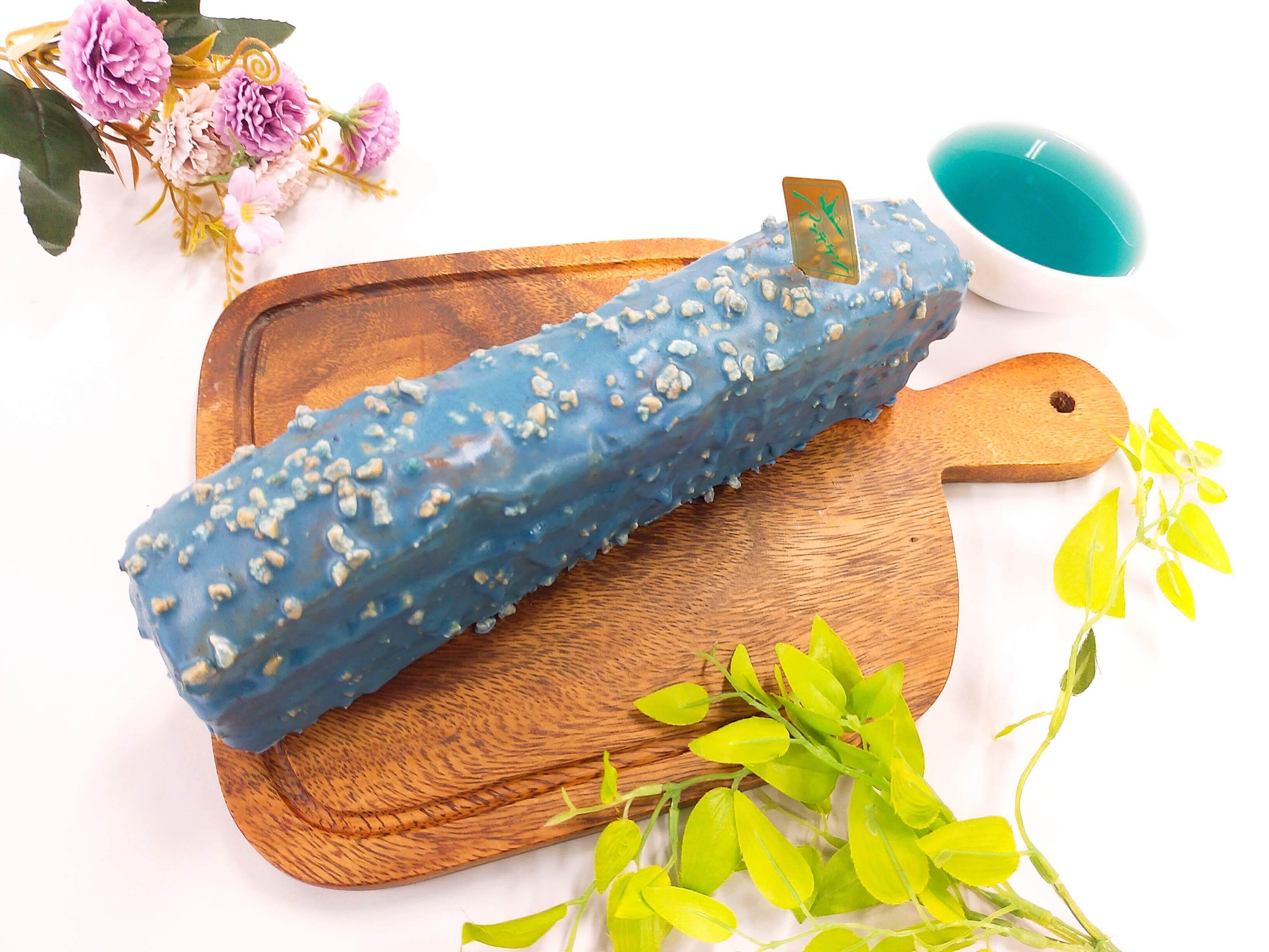 【びわ湖ブルー】バタフライピー(ハーブティー)で青色に色付けしたチョコレートをコーティングしたスリムパウンド。生地には野洲市にあるレイクファーム様のブルーベリーを使用した数量限定の商品。