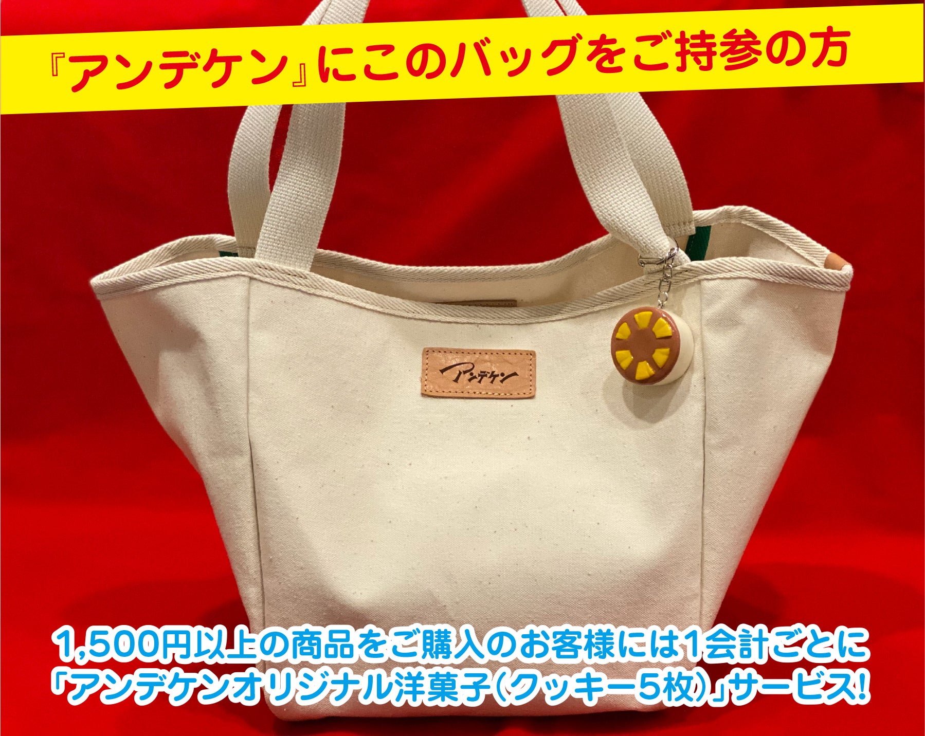 このエコバッグを持って、アンデケンの店舗で1,500円以上商品をお買い物をしていただければ、エコバッグ持参特典として特製クッキー5枚を1会計ごとにお付けさせていただきます!