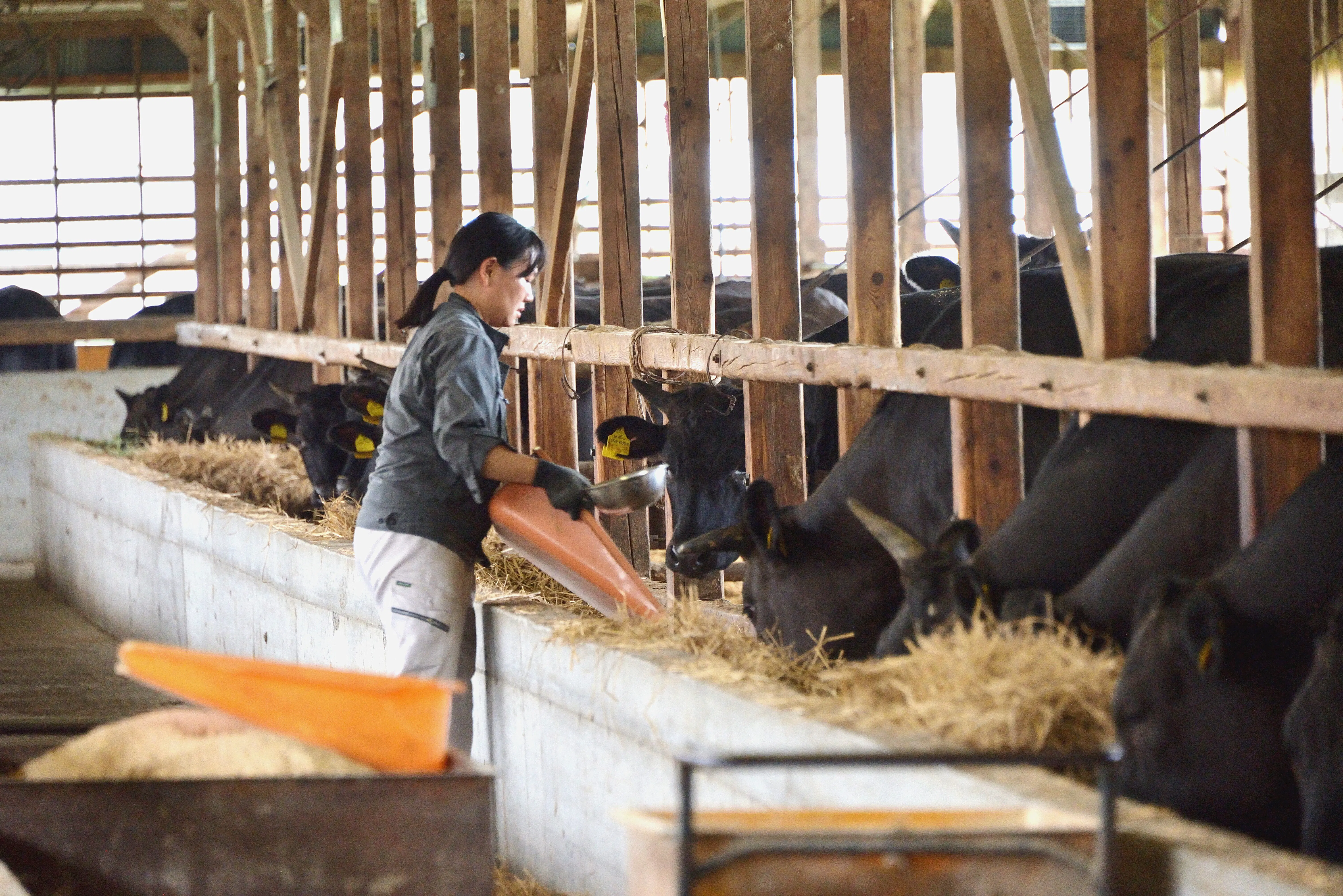 義祖父の代に豚から牛に切り替えたのが始まりだったそうです。最初は仔牛を買ってきて育てて売る、いわゆる“肥育”を行っていました。義父の代を経て夫が引き継いだのが14年前。当時は肥育牛が80頭のみの本当に小さい牧場だったそうですが、肥育だけでなく牧場で仔牛を生ませて育てる“繁殖”も行うことを決め、少しずつ繁殖牛を増やしてきました。今は繁殖牛80頭を含む、240頭の黒毛和牛を飼育しています。