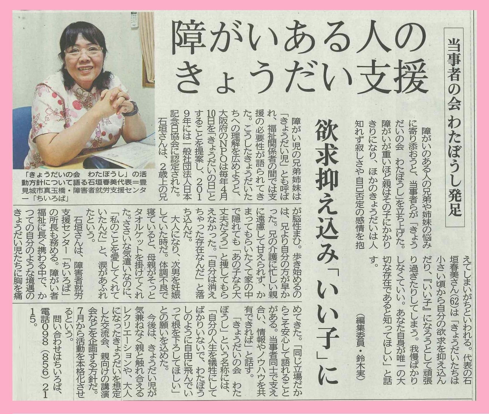 今から6年前に、沖縄県立島尻特別支援学校PTA主催の進路講話の中で、初めて父母向けの「きょうだい(児)の育ちと支援」について、話す機会がありました。反響が大きかったので、その後も支援学校や「親の会」主催で講演させて頂く中で、沖縄県にも「きょうだいの会」が、あったらいいなぁ・・・と、ずっと考えていました。