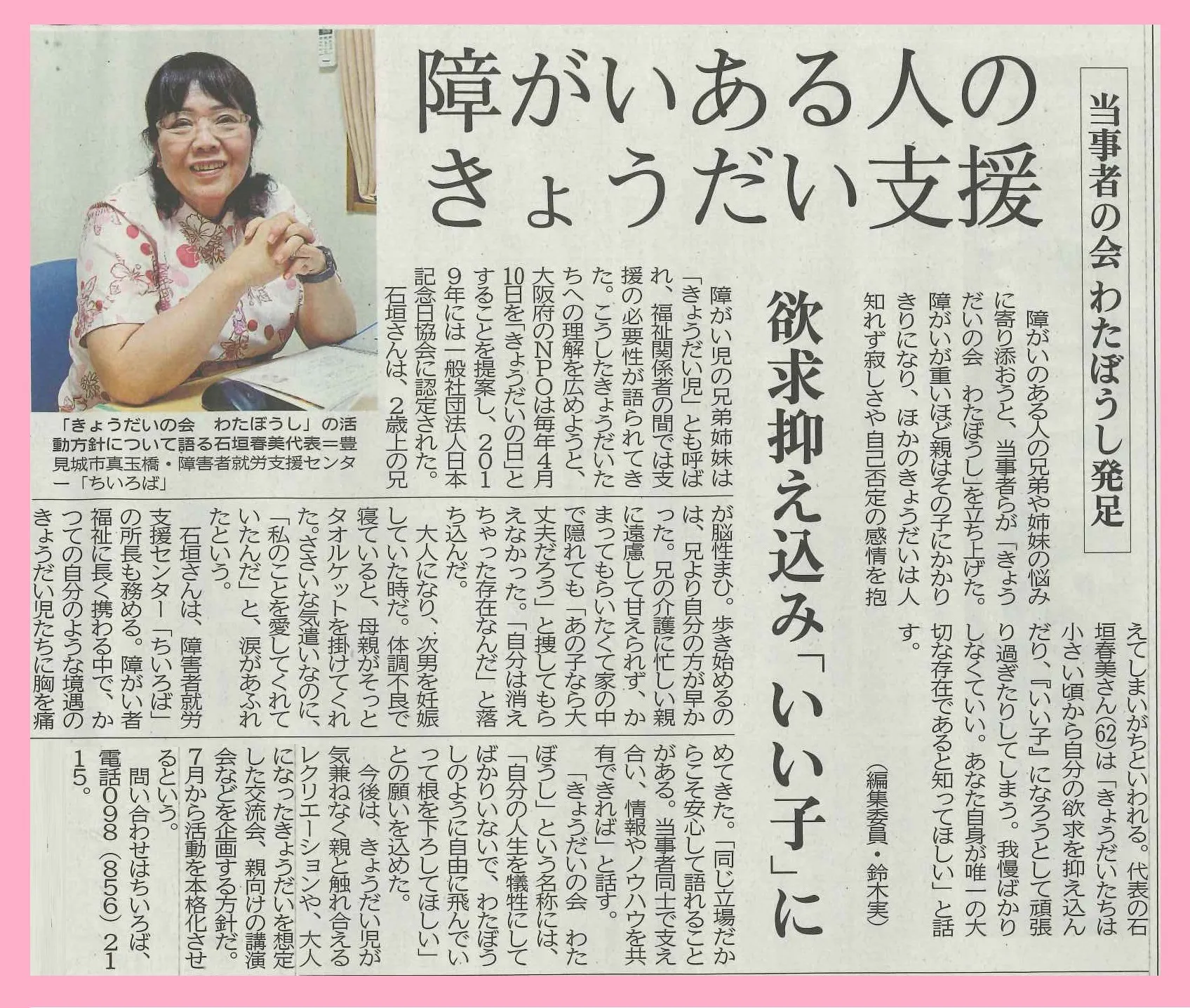 2021/09/15 16:00この度は、「きょうだいの会 わたぼうし」プロジェクトのご支援をありがとうございました。先月に着ぐるみ「ぎゅっ太」が完成し、沖縄タイムスの紙面、電子版にご掲載いただきました。https://www.okinawatimes.co.jp/articles/-/82847611月に「第1回障がい児交流会」を開催する予定です。詳細は後日、報告します。これからも応援よろしくお願いします。 もっと見る沖縄タイムスの取材がありました♪