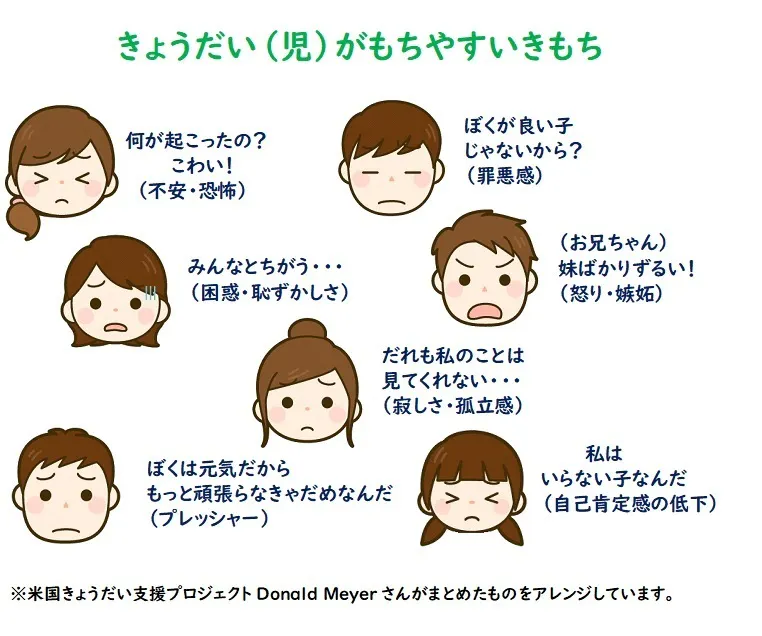 障害が重いほど親は、その子にかかりきりになり、ほかの「きょうだい」は人知れず寂しさや、自己否定の感情を抱えてしまいがちといわれています。「きょうだい」たちは、小さい頃から自分の欲求を、抑え込んだり『いい子』になろうとして、頑張り過ぎたりしてしまう傾向にある事が、報告されています。